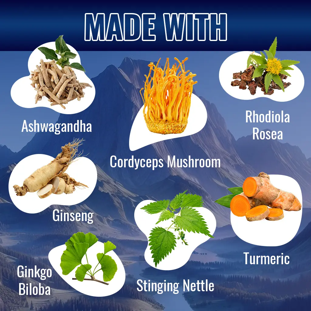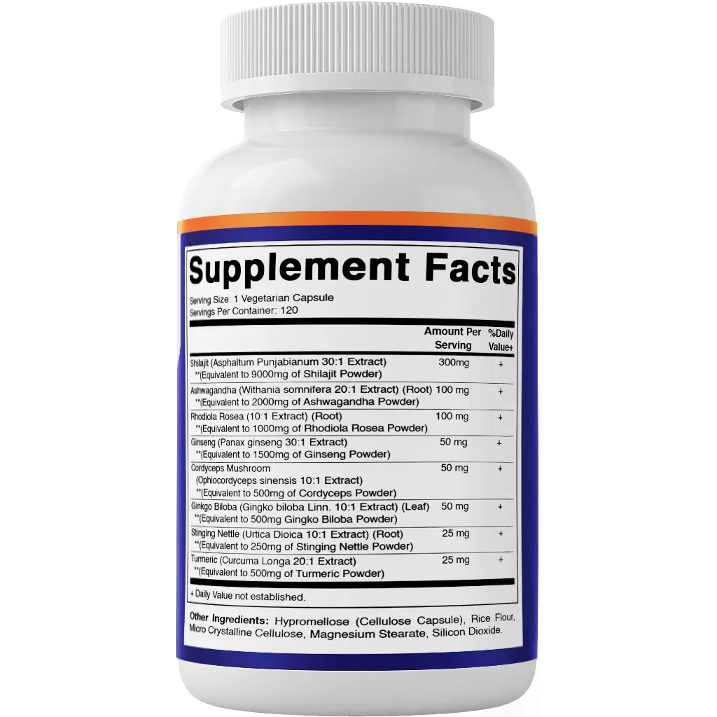 Shilajit 30:1 Extract, Ashwagandha 20:1 Extract (Root), Rhodiola Rosea 10:1 Extract (Root), Ginseng 30:1 Extract, Cordyceps Mushroom 10:1 Extract, Ginkgo Biloba 10:1 Extract (Leaf), Stinging Nettle 10:1 Extract (Root), Turmeric 20:1 Extract.