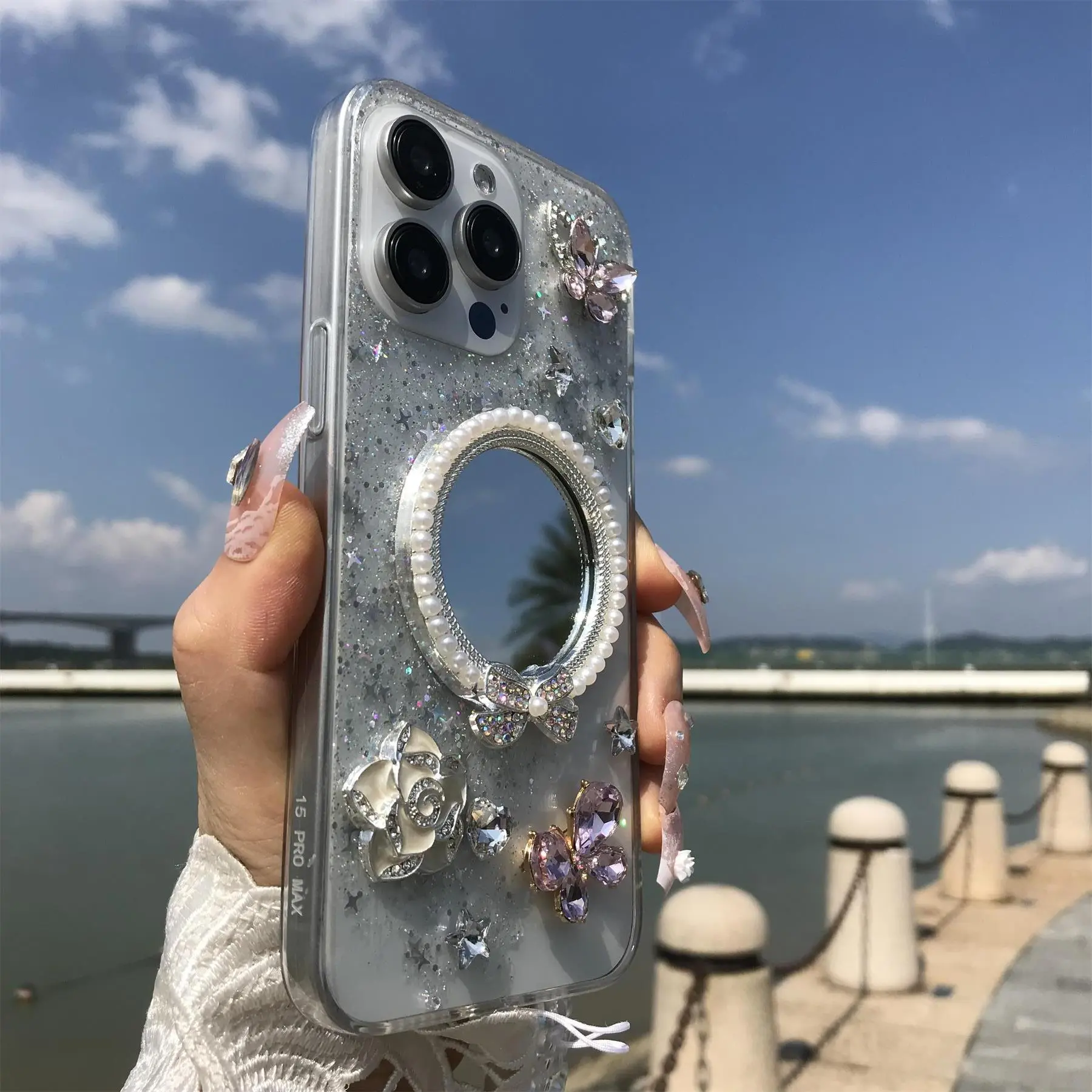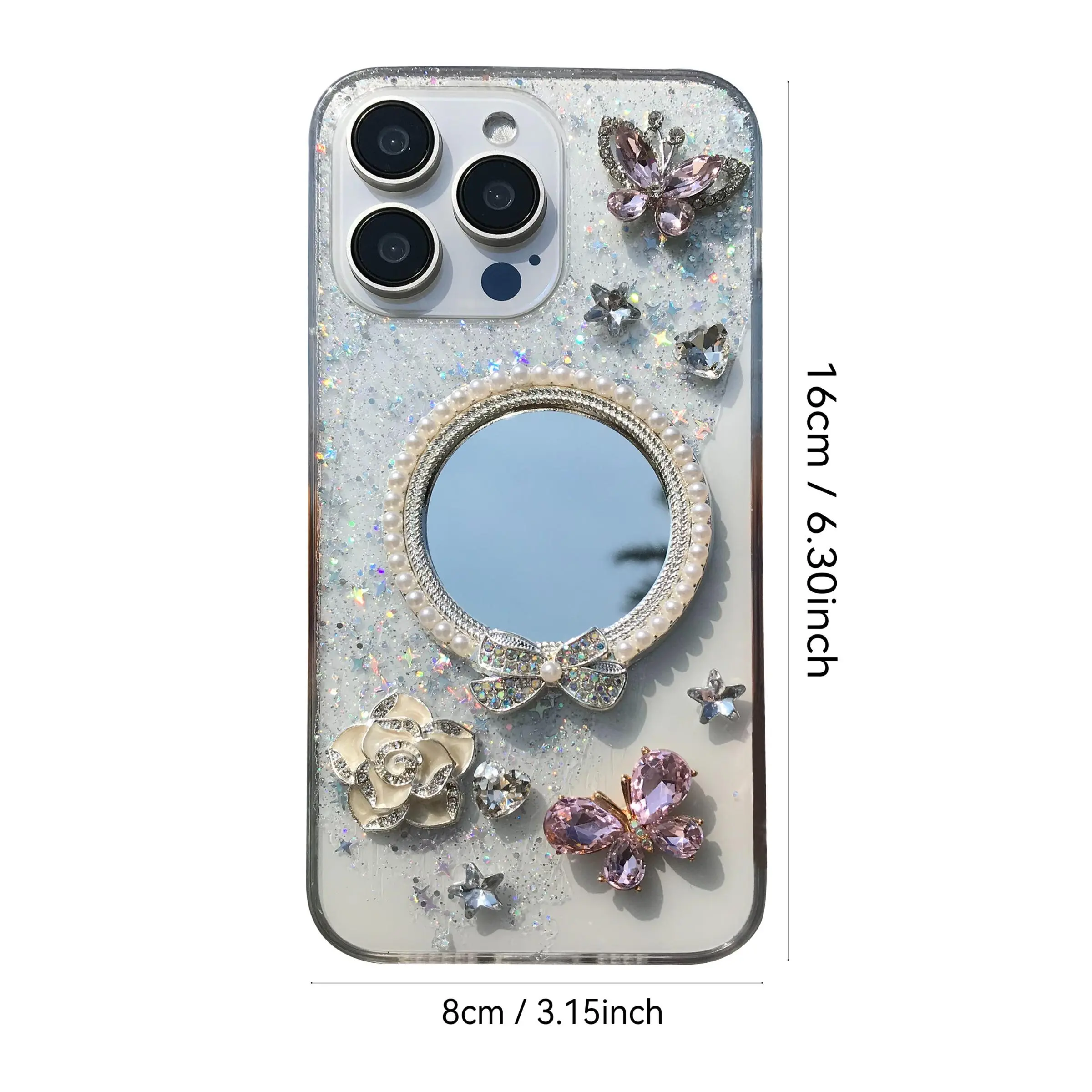 Tired of boring phone cases? This rhinestone decor case with mirror flower and butterfly accents instantly upgrades your iPhone’s style while keeping it safe. Crafted from durable plastic, it protects your device from everyday scratches and bumps without adding bulk. Plus, it fits a wide range of iPhone models including 16, 15, 14, 13, 12, and 11 Pro Max, so you’re covered no matter your phone. The included lanyard makes carrying your phone a breeze—clip it to your wrist or bag for quick access on the go. Each case is handmade, giving you a unique accessory that stands out from mass-produced covers. Whether you’re heading to work, a party, or just out and about, this case combines fashion and function effortlessly. Inside the box, you get the beautifully decorated protective cover and a matching lanyard. Ready to make your phone shine and stay safe? Grab this eye-catching case today and carry your phone in style!