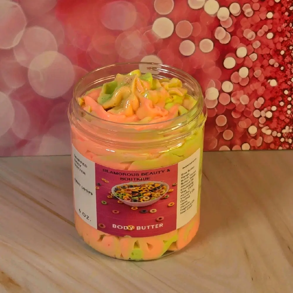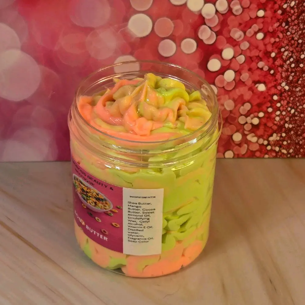 This handmade whipped body butter is the perfect addition to your skincare routine. Made with 2 different types of butter, this gentle formula nourishes and protects your skin, leaving it incredibly soft and smooth. Scent is Fruit Loops.