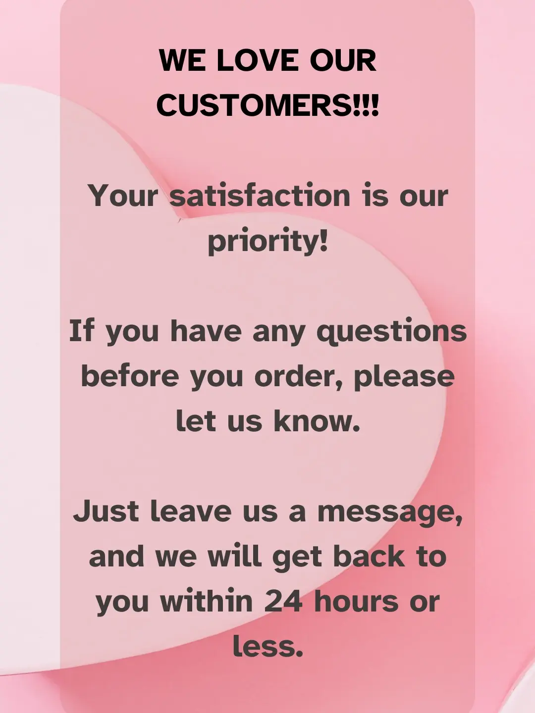If you have any questions before you order, please let us know. We are more than happy to help you!. Just leave us a message, and we will get back to you within 24 hours.