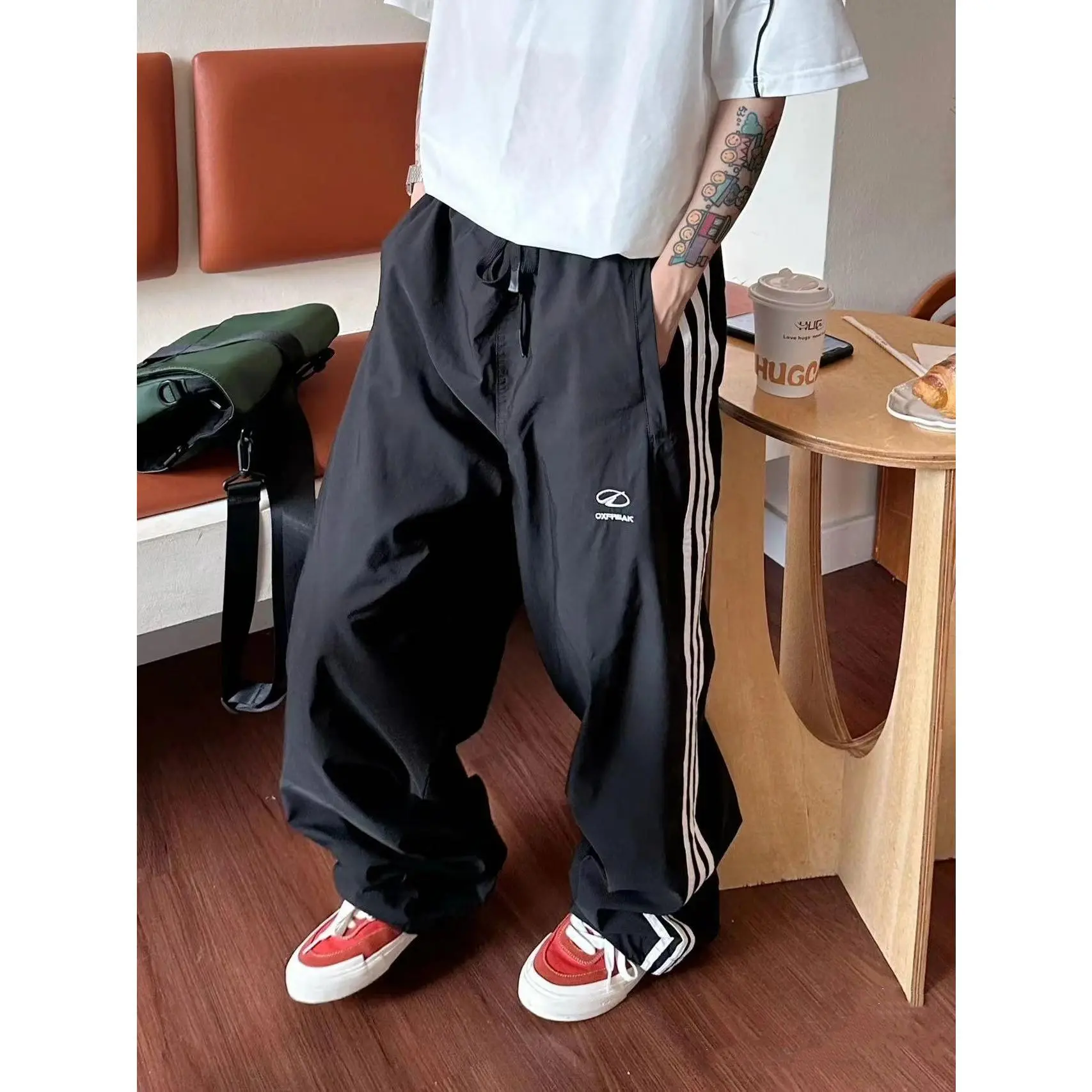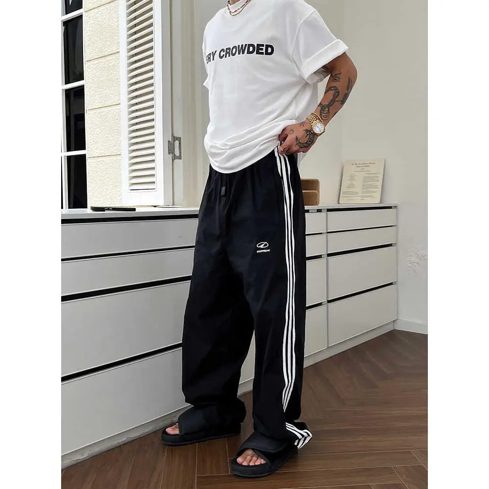 Men's vintage street-style quick-dry striped straight-leg casual pants, autumn trendy and versatile vibe loose sweatpants with a striped design aesthetic.