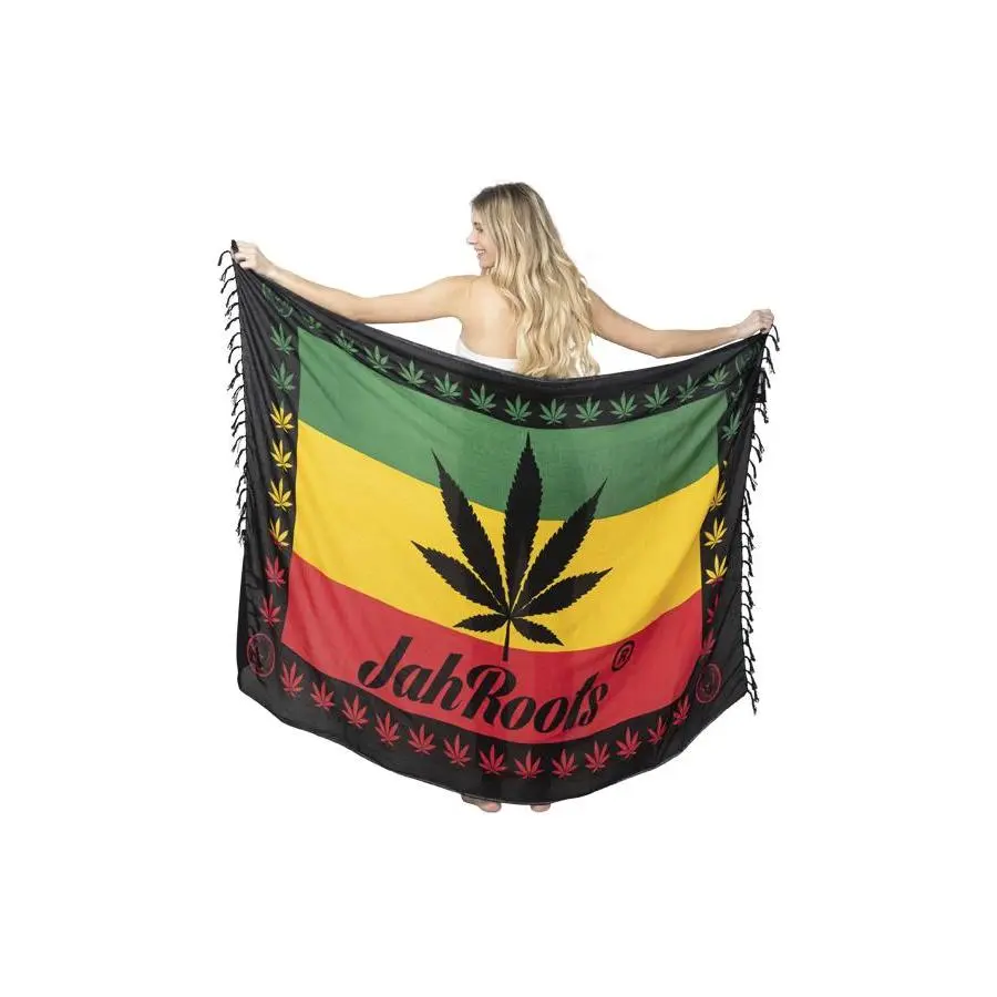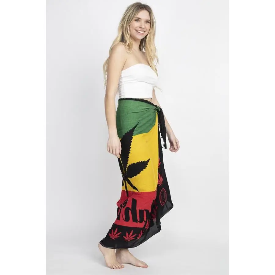 Embrace your free spirit with this multi way JahRoots Leaf wrap. This is the fashion accessory that can be used in 50 different ways. Wear it as a dress or skirt during the summer, then use it as a shawl or scarf during the winter. It can even serve as a beach towel for soaking up sun or as a throw for relaxing at home. The fabric is soft and light, keeping you comfortable no matter how you wear it. Pair with our other rasta items for a complete look.