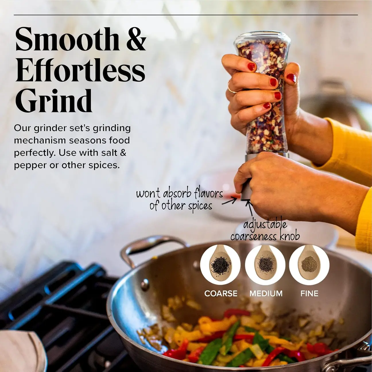 Our salt grinder and pepper mill are designed with the grinding mechanism on the top, preventing any unnecessary spillage onto your table or counter.