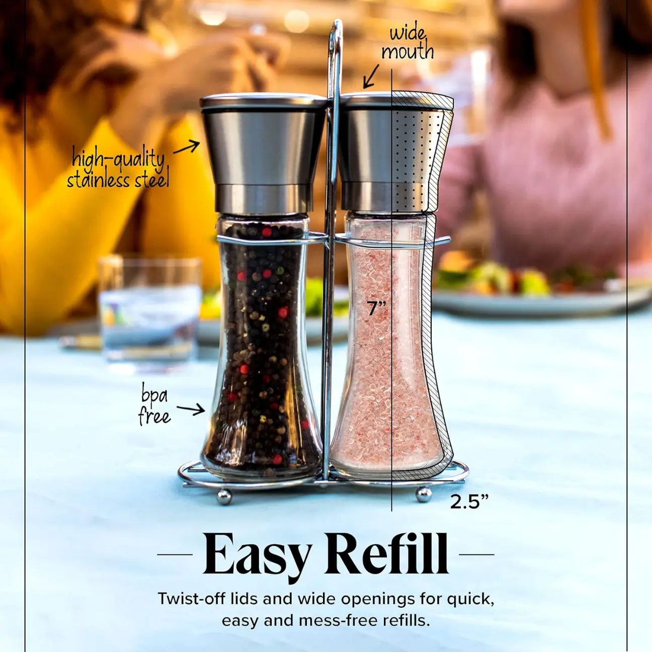 Constant refills making you a little salty? We designed our salt and pepper grinders to be large enough to avoid that mess! The stainless steel top also twists off for easy refill access.