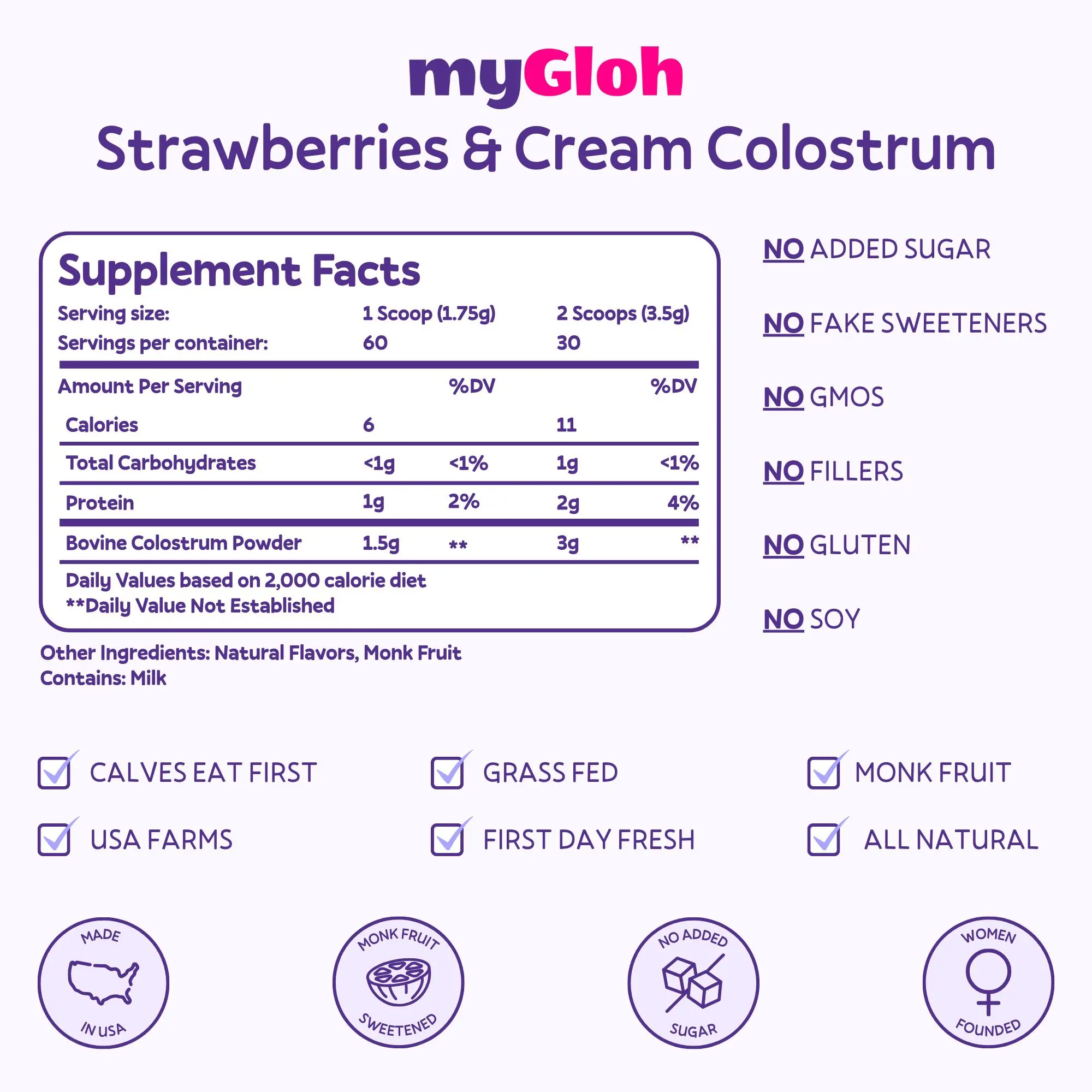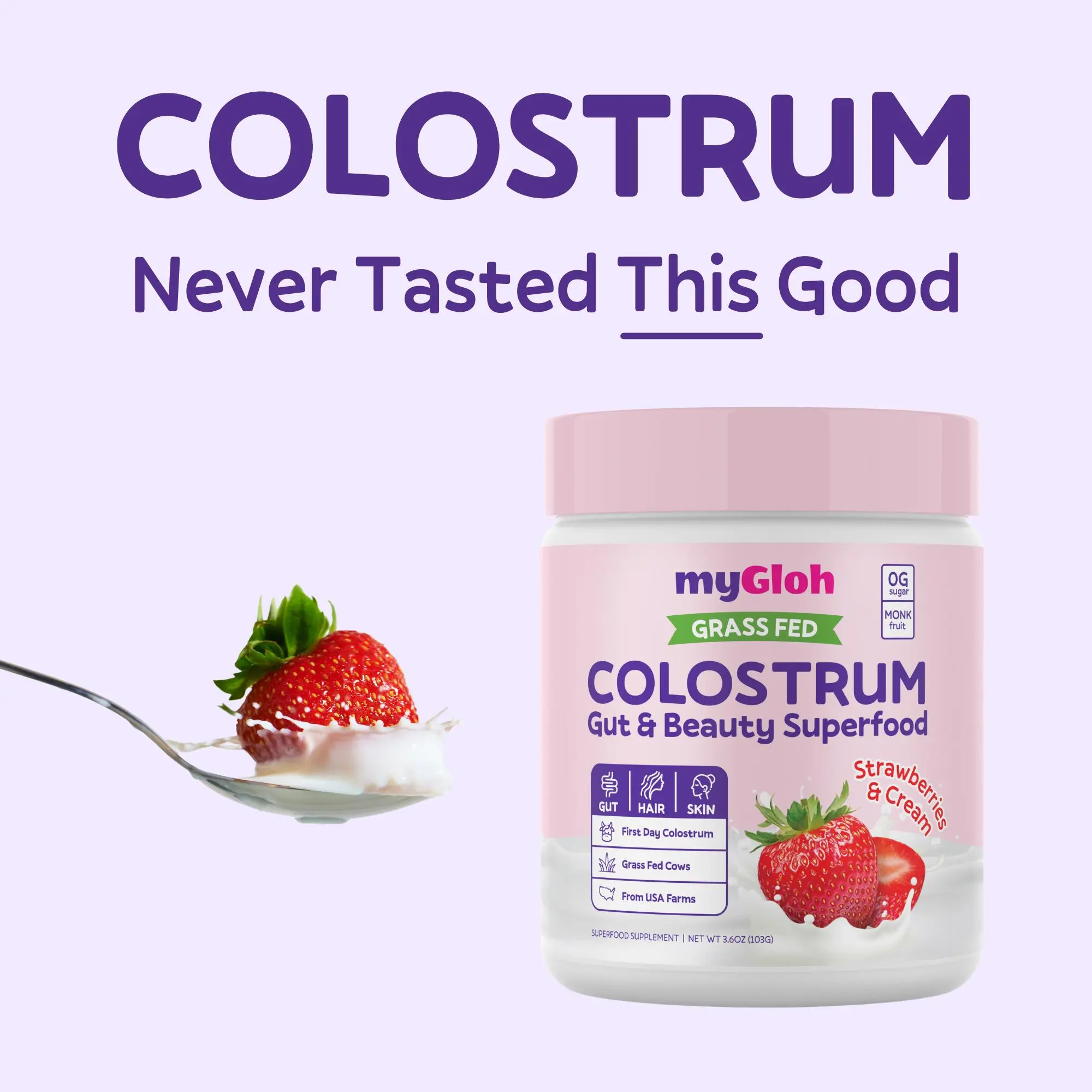 myGloh Colostrum Premium Powder | Gut Health & Bloating, Hair Growth & Skin Glow Beauty Supplement, Immune Support | Natural Flavor Strawberries & Cream | Grass-Fed Bovine Colostrum Superfood | High IgG, Gluten Free, Bioactives | Healthcare