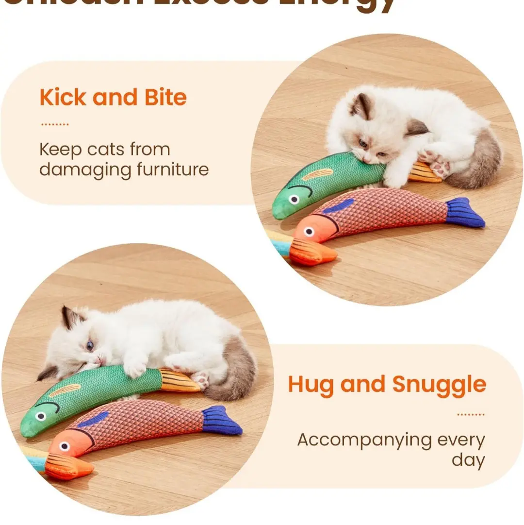 The catnip fish kicker toys are the perfect companion for your feline friends. Made of soft plush material and baby-level cotton, these toys are soft and comfortable for your cats to snuggle and chew. The organic catnip filling is 100% pure, potent, and organic, making it a favorite natural herb for most cats. The catnip will maximize the chance to make cats excited and make interactive playtime irresistible.