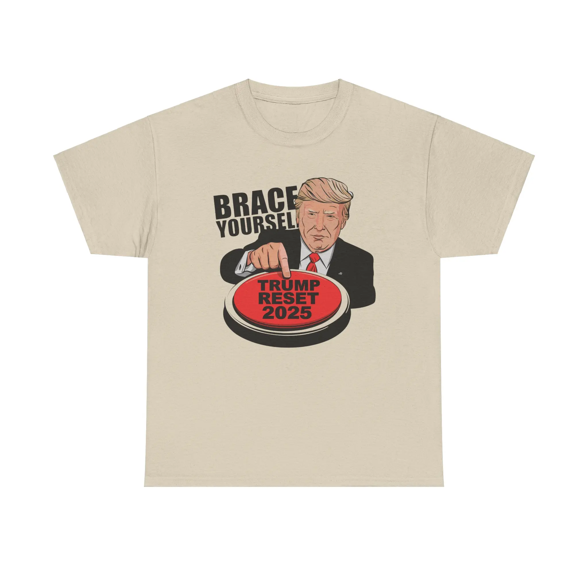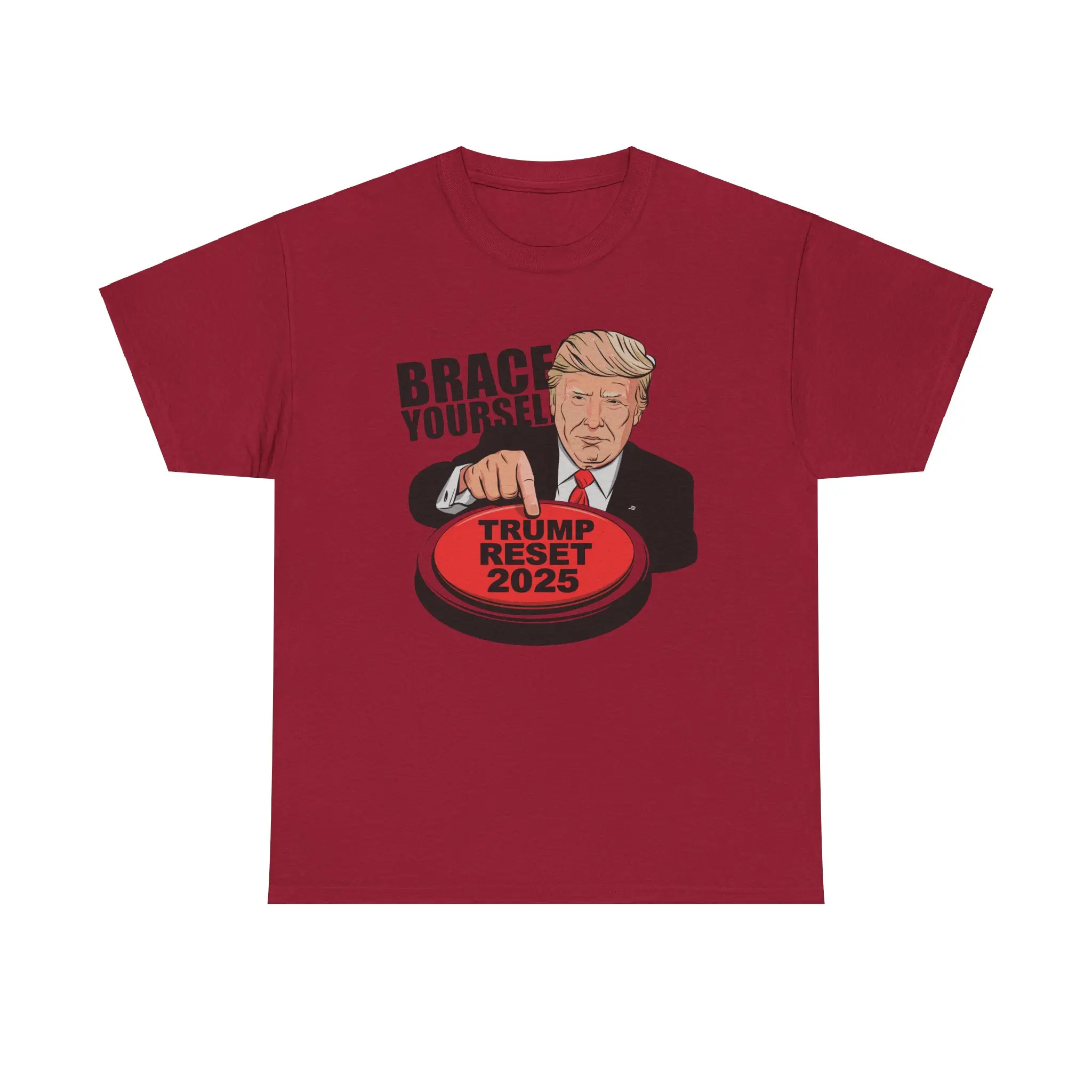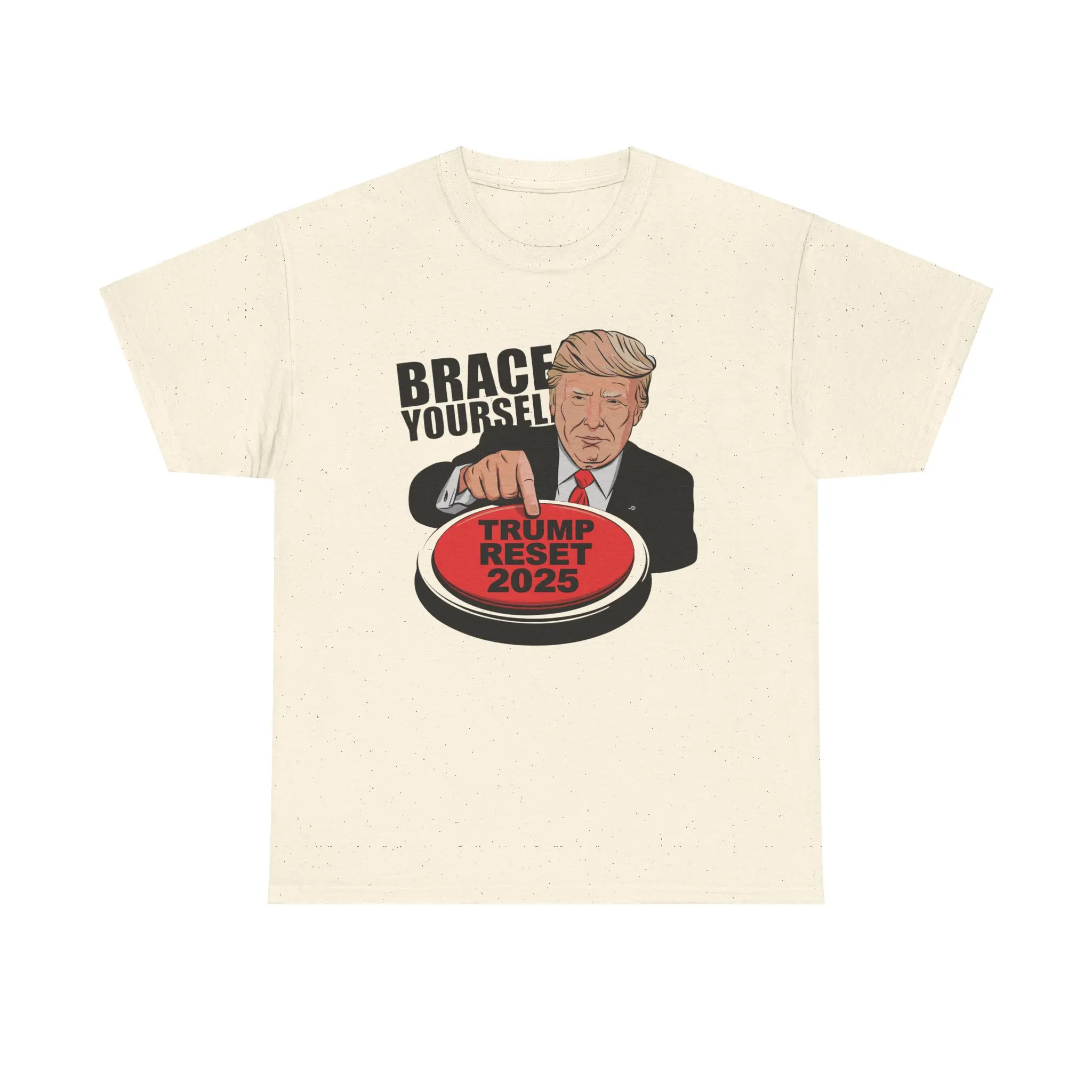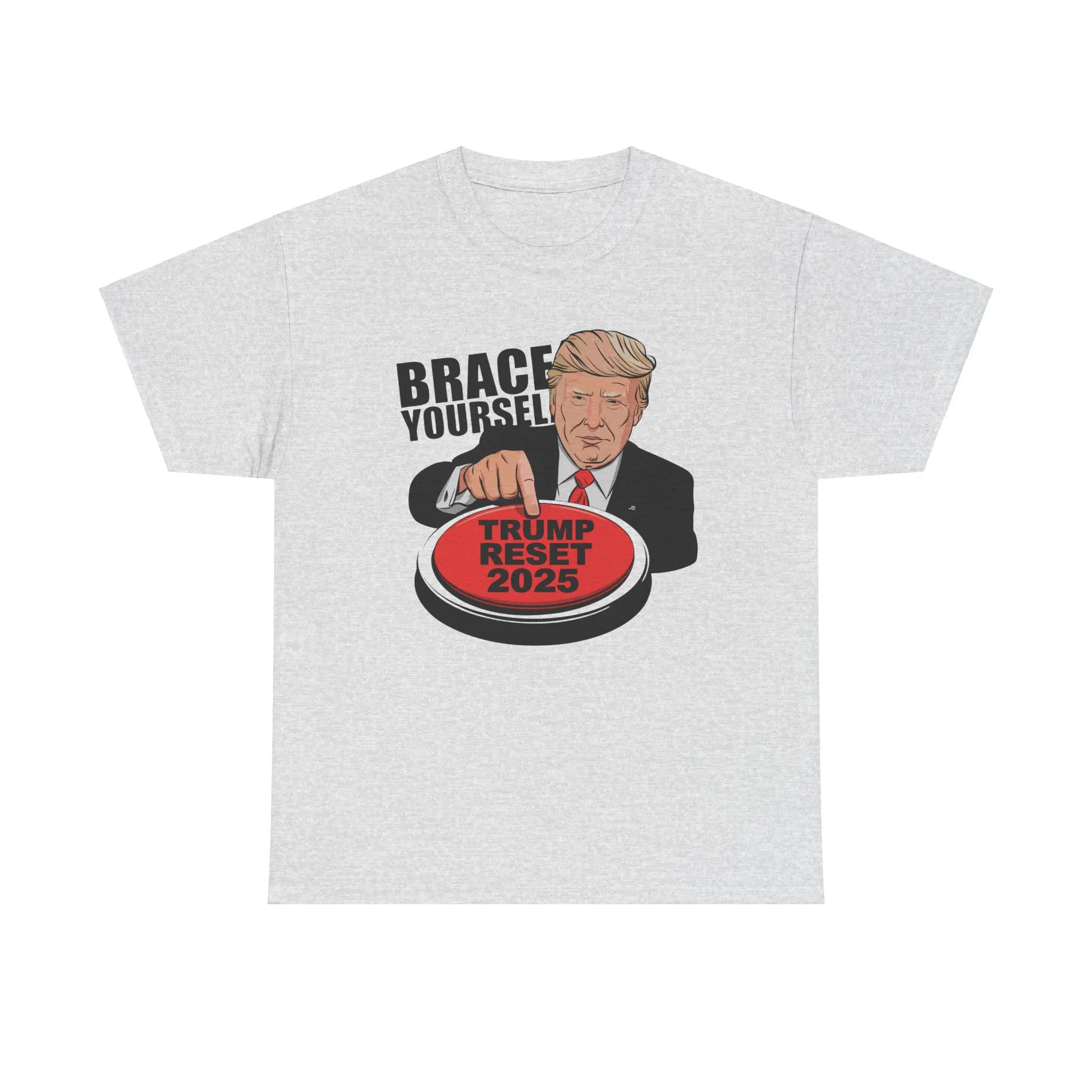 A trendy and versatile T-Shirt featuring the phrase 'Brace yourself trump reset 2024'. This T-Shirt exudes a casual and laid-back vibe, perfect for everyday wear or making a statement. Ideal for those who are politically aware and want to express their views. Suitable for occasions like political rallies, protests, or casual outings.
