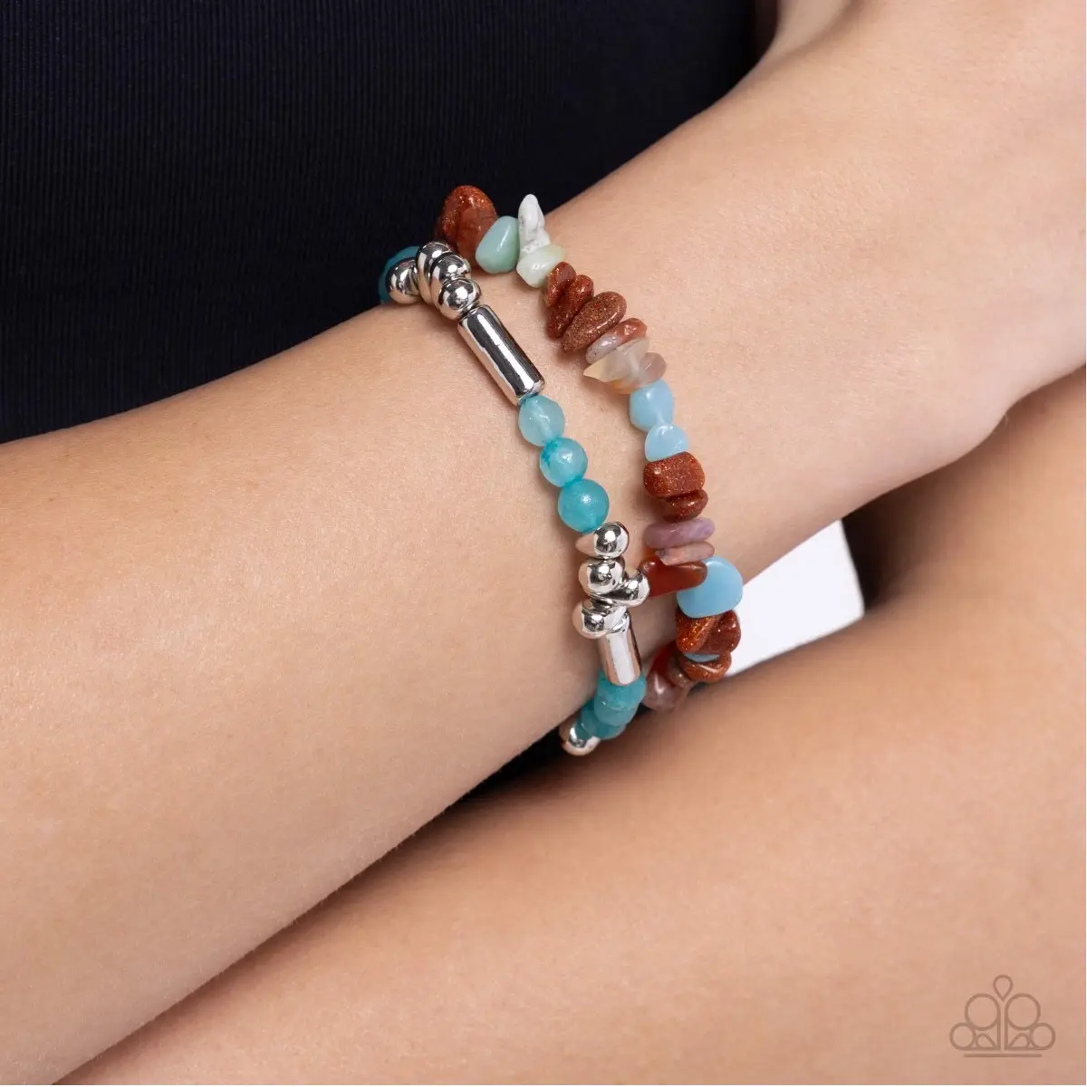 This stretch bracelet is a beautiful accessory designed for women. The bracelet features a combination of turquoise, brown, and silver colors that create a unique and stylish look. The turquoise color adds a pop of color to the bracelet, while the brown color creates a natural and earthy look. The silver color adds a touch of elegance and sophistication to the bracelet.