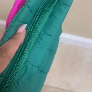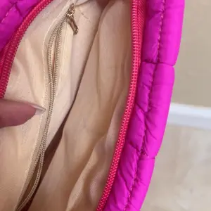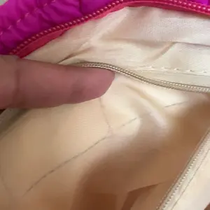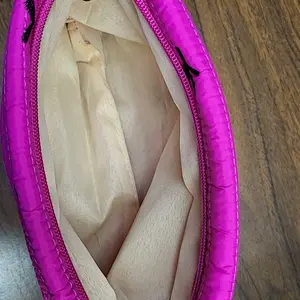 The inside lining is very cheap. I hate it! The outside looks just like the picture, but because the inside is poorly made with the loose fitting it doesn’t allow as much dos e as there could be. The pink bag zipper is orange.