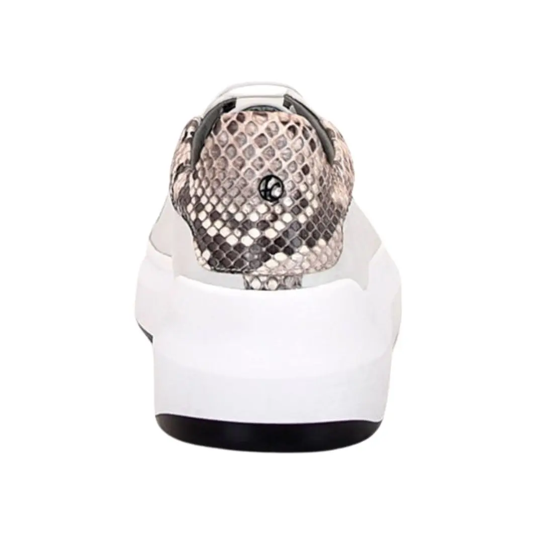 Women’s tennis shoes in genuine bovine leather with python applications, featuring a high relief geometric design with laces and a two-tone, dual-density sole.