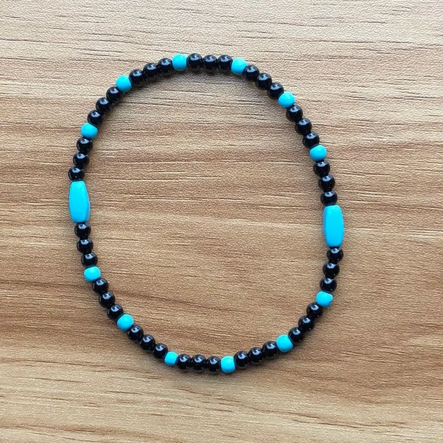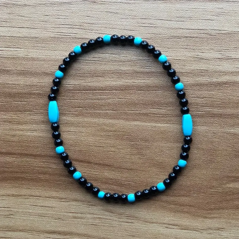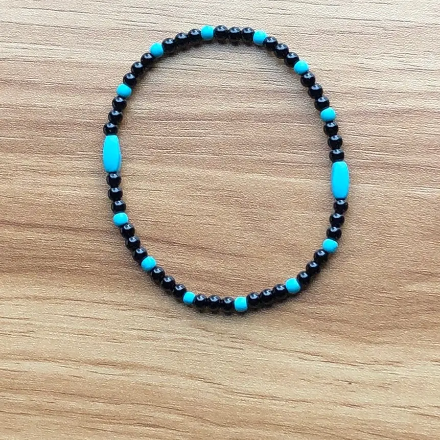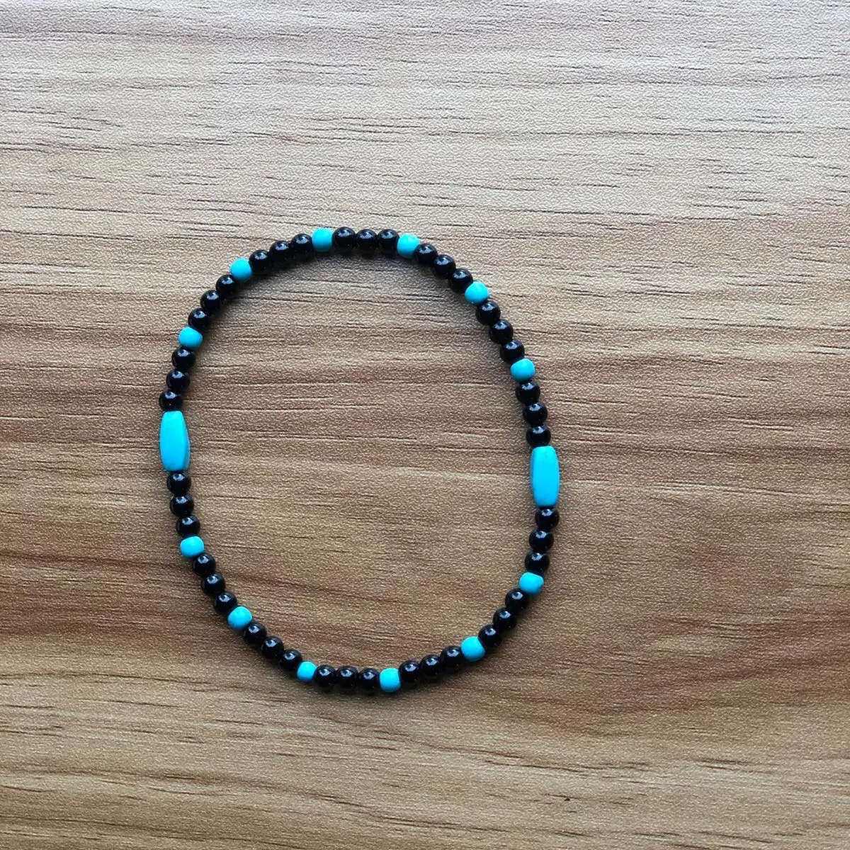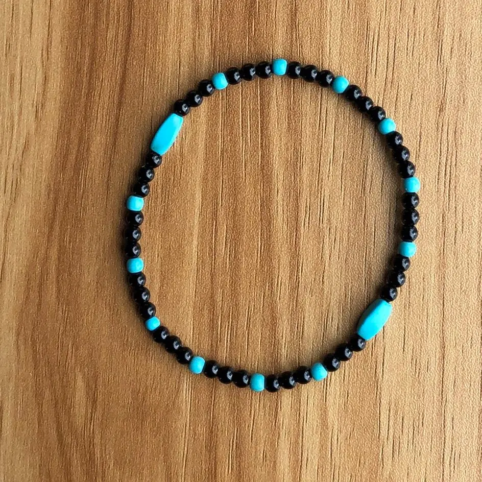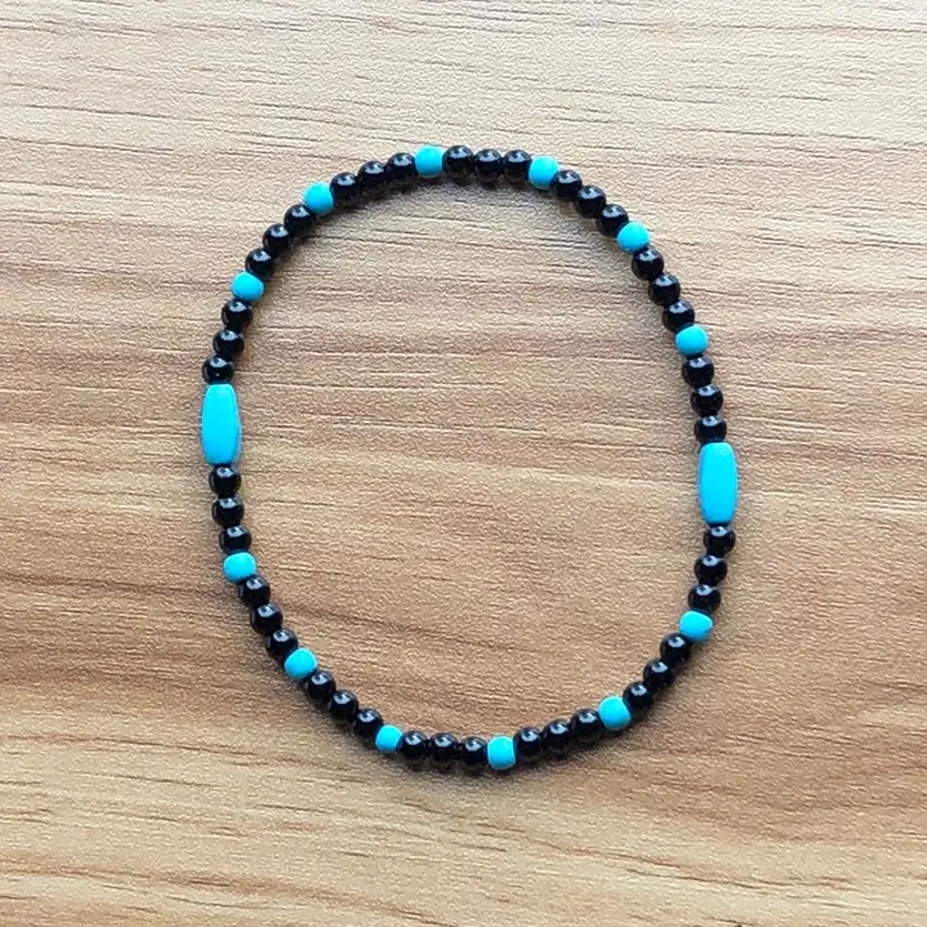 This anklet is a beautiful piece of jewelry that features black tourmaline and turquoise stones. The black tourmaline is known for its protective properties, which can help to ward off negative energy and promote a sense of calmness and tranquility. Meanwhile, the turquoise is believed to bring good luck, enhance communication skills, and promote overall well-being.
