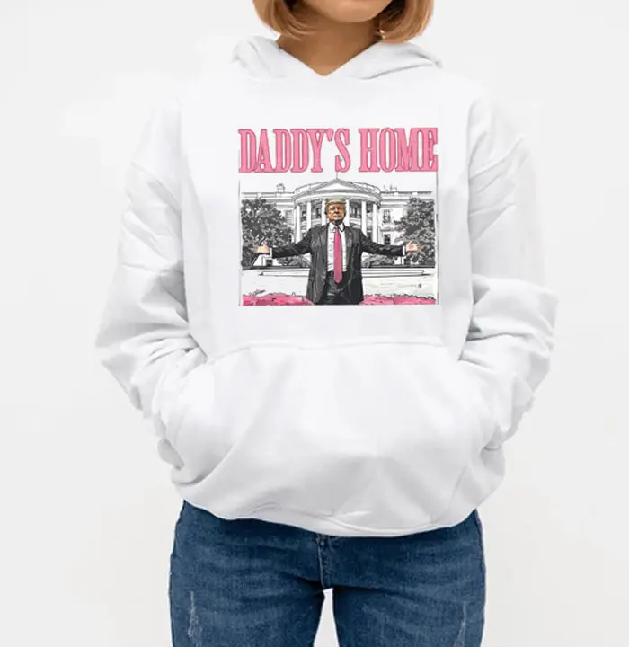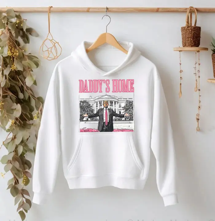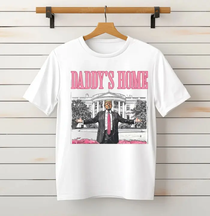 The "Daddy's Home White House Pink Trump 2024, MAGA Supporter Election 2024 Graphic PNG" shirt features a bold, politically charged design aimed at supporting former President Donald Trump's 2024 campaign. The shirt likely uses a combination of vibrant colors, with a focus on pink and white hues. The text "Daddy's Home" is paired with a graphic of the White House, possibly in a playful or humorous style, along with the words "Trump 2024" and "MAGA" (Make America Great Again) to represent support for Trump's re-election bid.