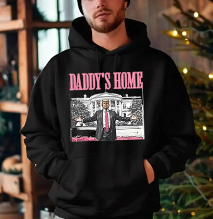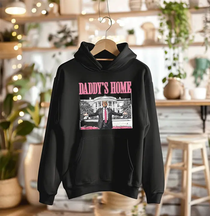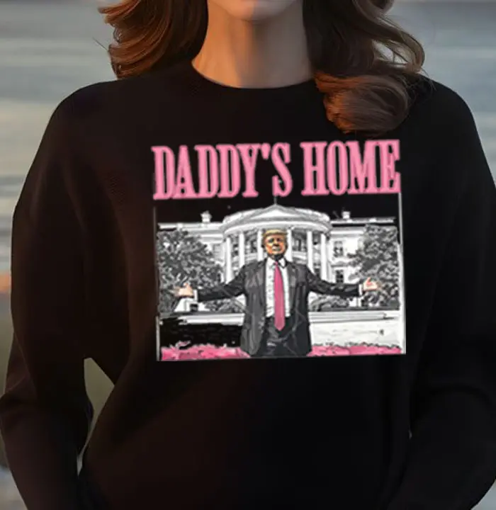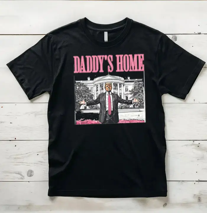 The "Daddy's Home White House Pink Trump 2024, MAGA Supporter Election 2024 Graphic PNG" shirt features a bold, politically charged design aimed at supporting former President Donald Trump's 2024 campaign. The shirt likely uses a combination of vibrant colors, with a focus on pink and white hues. The text "Daddy's Home" is paired with a graphic of the White House, possibly in a playful or humorous style, along with the words "Trump 2024" and "MAGA" (Make America Great Again) to represent support for Trump's re-election bid.