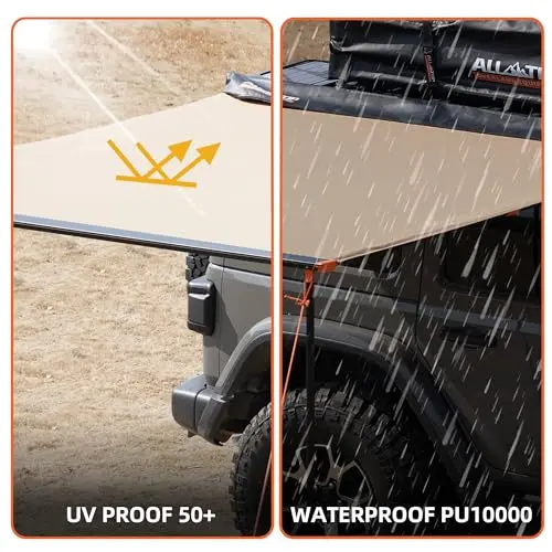 ·【Overland Must-Have】Made of 280GSM Polyester-Cotton Ripstop Fabric, which provides PU 10000mm Waterproof & UV 50+ Sun Proctection for you. The whole Awning system is grouped in a heavy-duty Weatherproof Storage Bag, which is made of 1000D PVC, allowing you to enjoy camping at anywhere and in any weather.