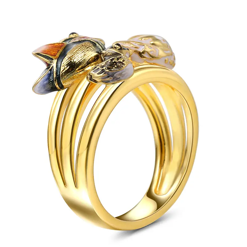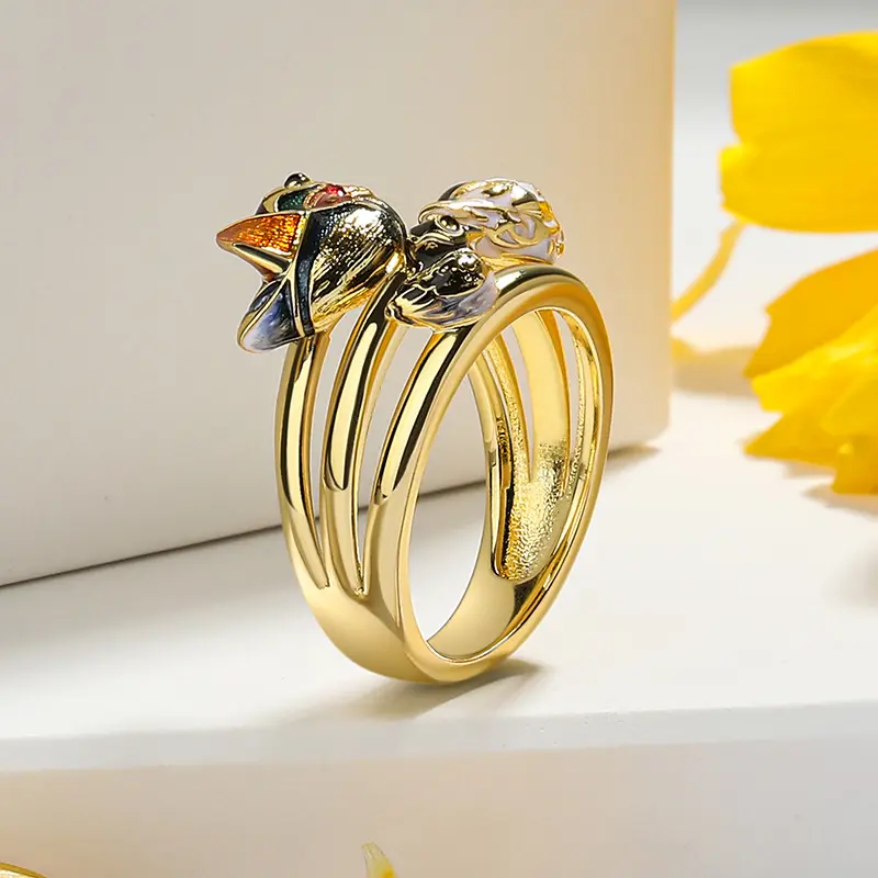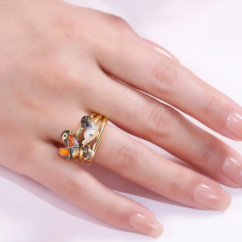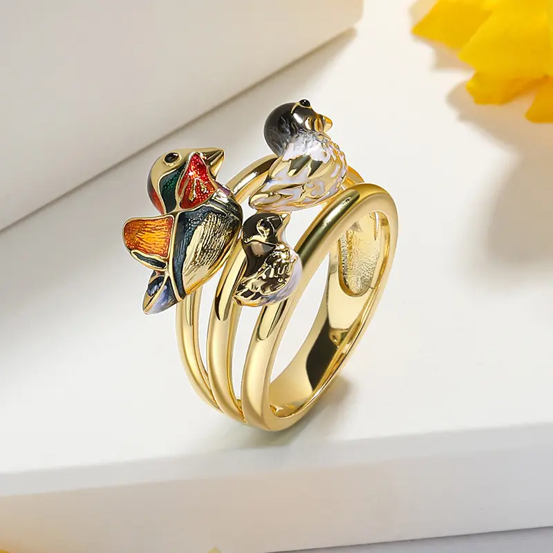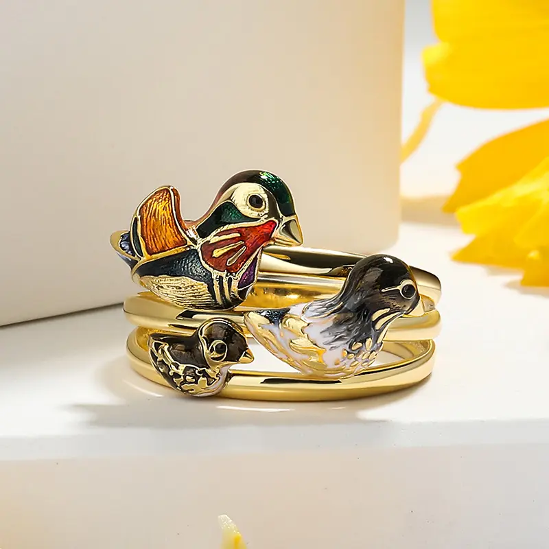 Mandarin ducks are believed to be faithful to their partner and are symbols of love, affection and loyalty. In Feng Shui, they are considered a symbol of love and marriage and are referred to as a pair of lovebirds. Crafted in gold tone sterling silver with multi-colored enamel, this ring features papa duck, mama duck and baby duck happily outing together. Add this beautiful piece to your jewelry box and you won't be disappointed.