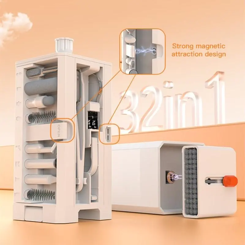 Ever struggle to clean those tiny, tricky spots on your phone or tablet? This 32-in-1 Digital Cleaning Tool set is your new best friend for keeping gadgets spotless. Whether it's dust in your charging port, smudges on your screen, or dirt around your camera lens, this multi-functional kit has the right tool for the job. The magnetic design keeps each piece neatly in place, while the storage body doubles as a handy organizer with slots for your SD and game cards. From soft brushes for delicate screens to tweezers and a capacitive pen for precision cleaning, it covers all your digital device needs. Plus, the extension pole and hook-shaped heads help you reach those annoying tight spots. Included are also specialized brushes for Bluetooth earphone cases, speaker holes, and keyboard keys, making daily maintenance a breeze. Keep your tech looking fresh and performing at its best with this all-in-one cleaning solution. Ready to give your gadgets the TLC they deserve? Grab your kit today and start cleaning smarter, not harder!