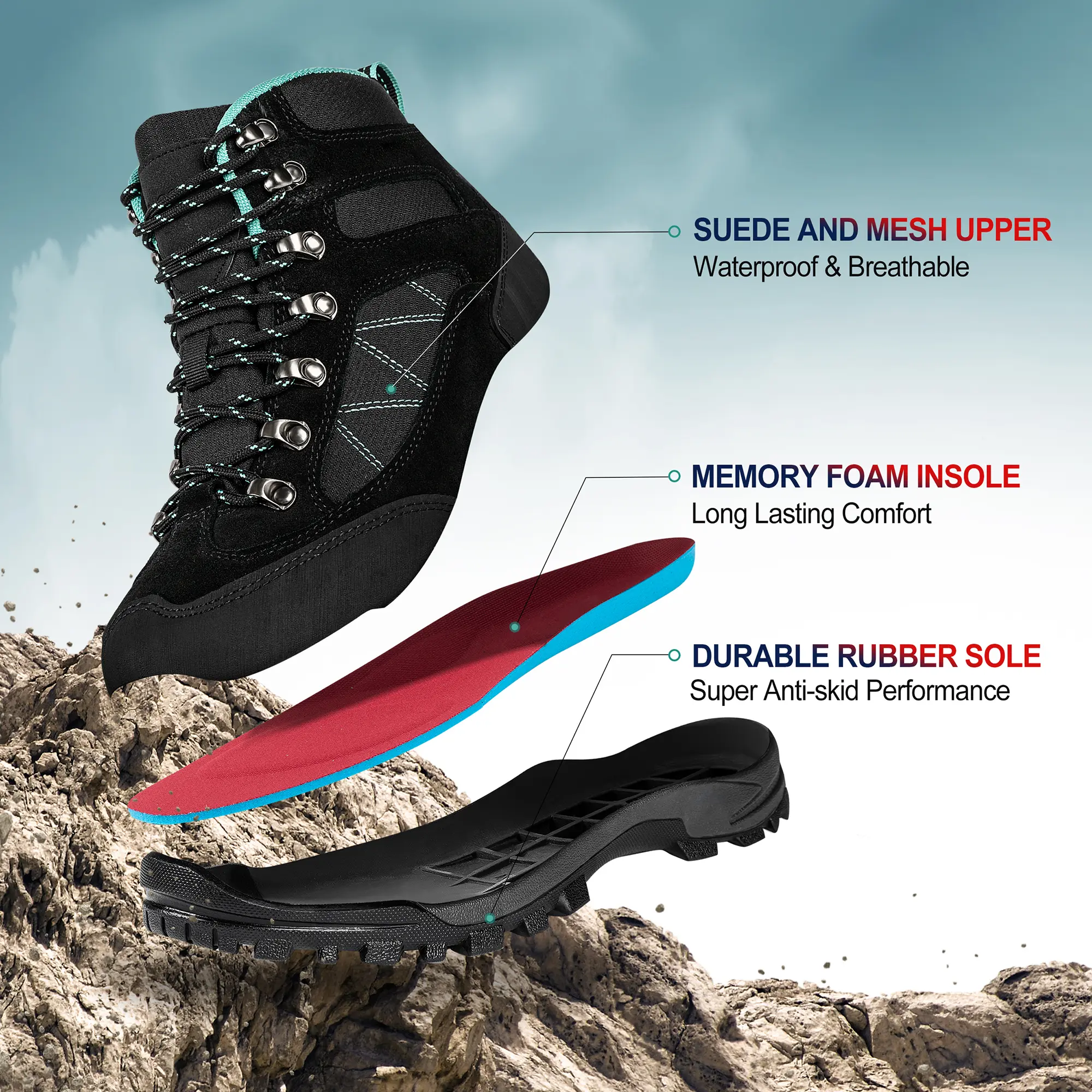 ·WATERPROOF & BREATHABLE - This women's waterproof hiking boots features a waterproof membrane that seals out water and lets moisture escape, which keeps you dry and comfortable no matter the conditions. Mesh upper for increased breathability.