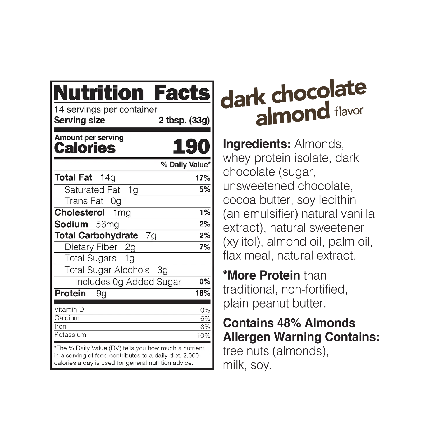 The Nuts 'N More high protein dark chocolate almond butter flavor is made from only the freshest almonds, packed with whey protein isolate and flax for added protein and Omega 3’s. Our natural cocoa adds a subtle chocolate flavor, without the worry of added sugars.