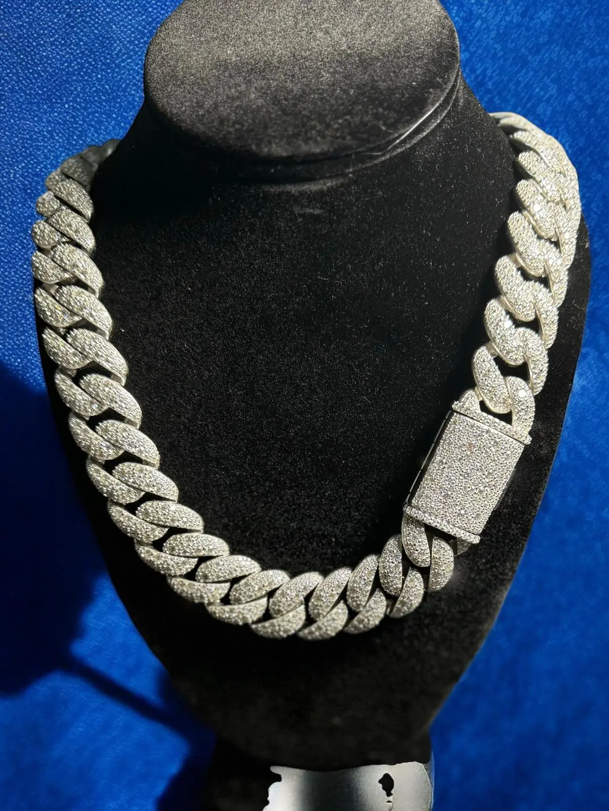·Chain features custom mosaic set diamond Links that with a "Sleek Lock" which provides additional security, while flaunting an elevated aesthetic edge to your chain.Each diamond is handset by our master diamond setter which showcases its impeccable design Crafter from pure 925 Sterling Silver and dipped in triple layer of 14k White gold plating. This Master of Bling Necklace is sure to set a style statement of its own and set you apart from the rest. And a perfect gift for a loved one to treasure forever.Moissanite Diamonds pass the diamond tester