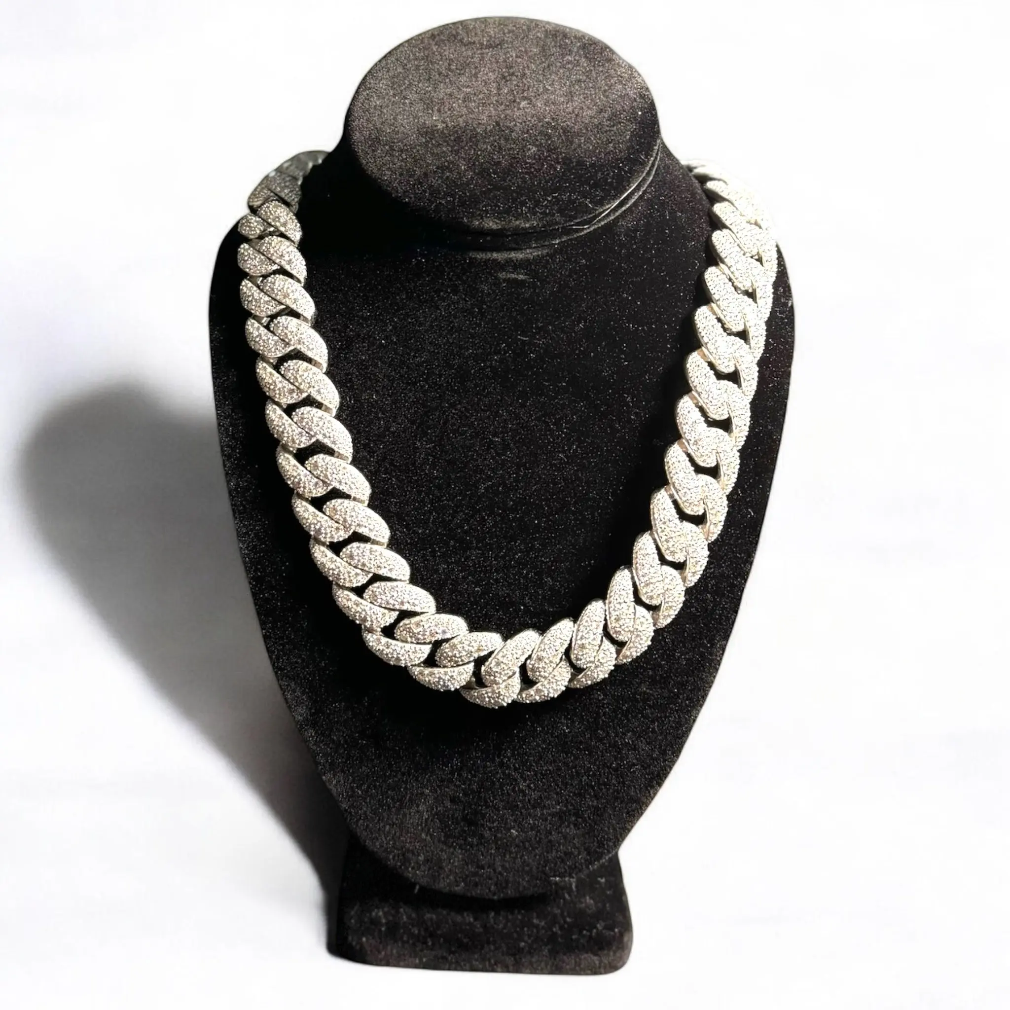 This Master Of Bling Custom Mosaic Set Miami Cuban Necklace is made of pure 925 sterling silver, studded with Mosaic Set diamonds throughout the link.