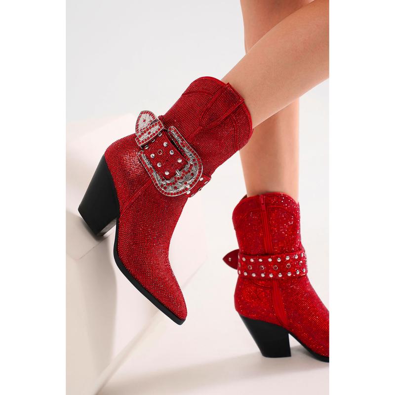 Beast Fashion ANTONIA-03 Rhinestone Buckle Western Boots Red Pointed Toe 3.5 Inch Heels Side Zipper Faux Leather Sparkly Onyx Party Shoes #fashionsneakers #PatchworkStyle #trendingshoes #boot #fyp
