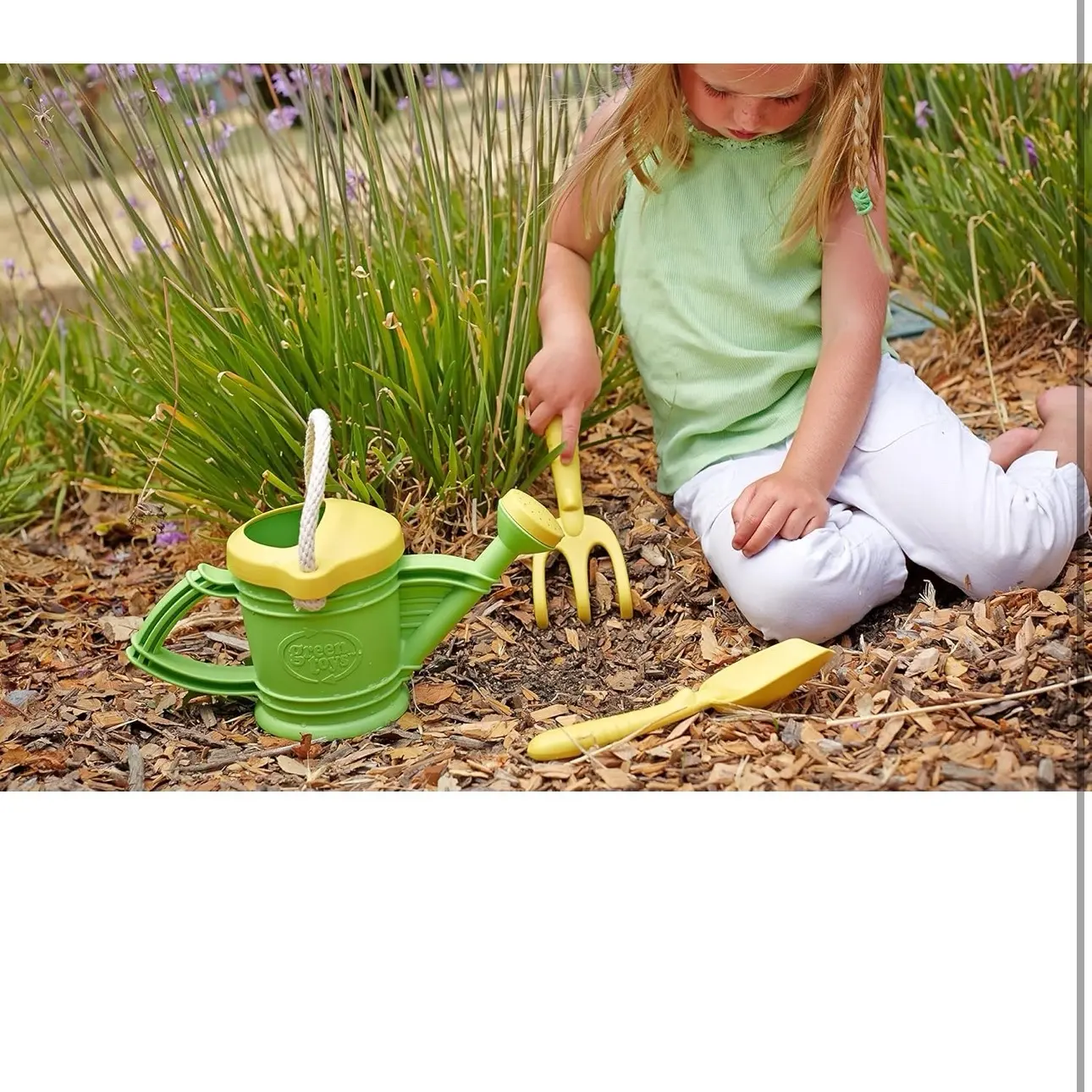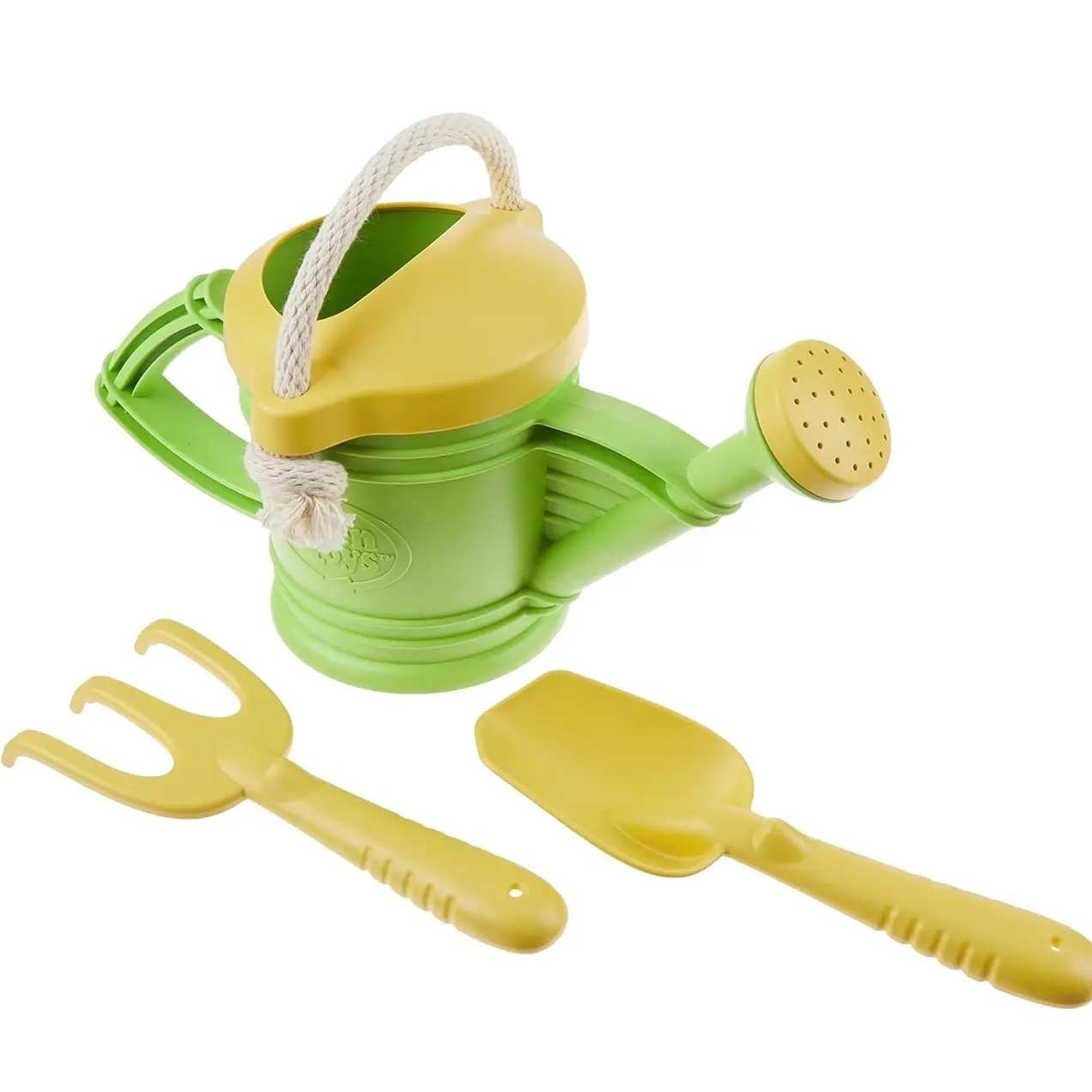 Green Toys Watering Can Set with Rake, Shovel and Cotton Rope Carrying Handle for Kids to Learn about Eco-Friendly Gardening