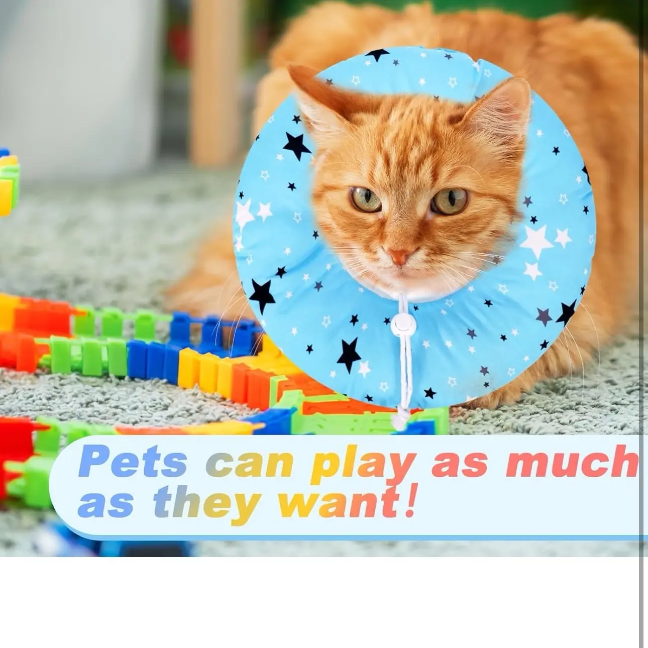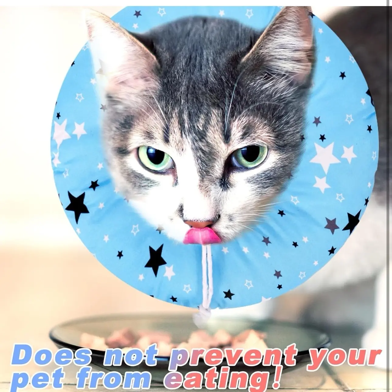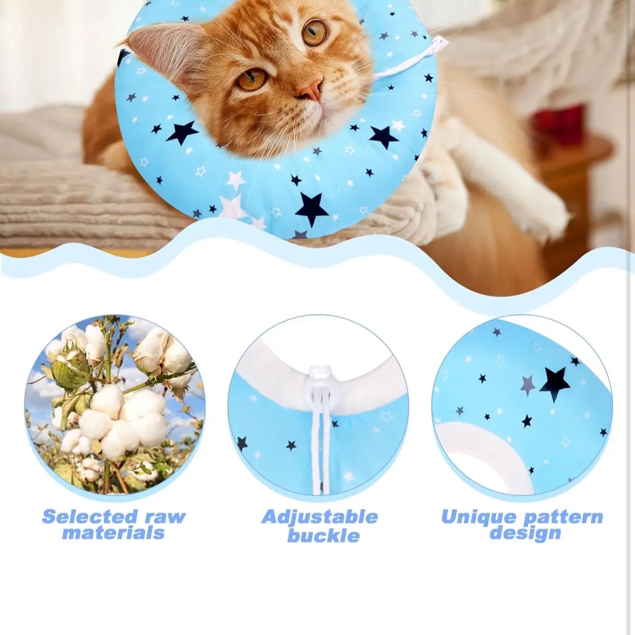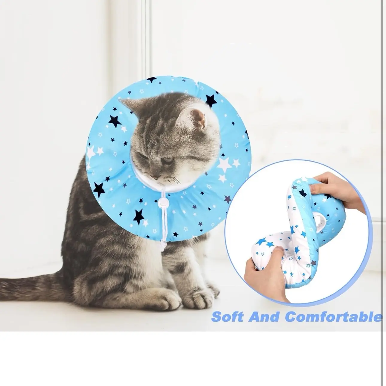 The Cat Cone Collar is a soft and comfortable collar designed to provide protection for cats during wound healing or after surgery. The collar is shaped like a donut and is adjustable, making it suitable for kittens, puppies, and dogs.