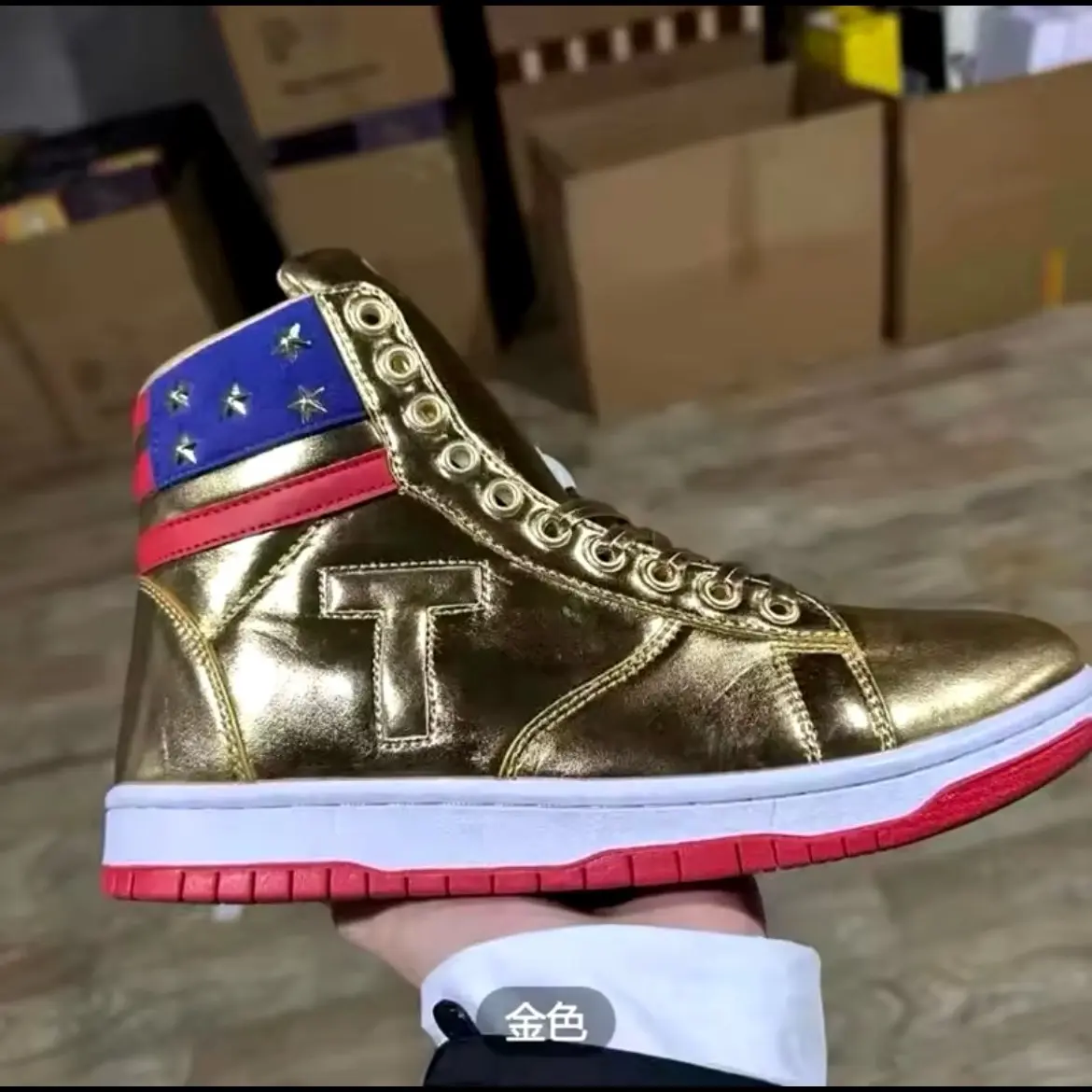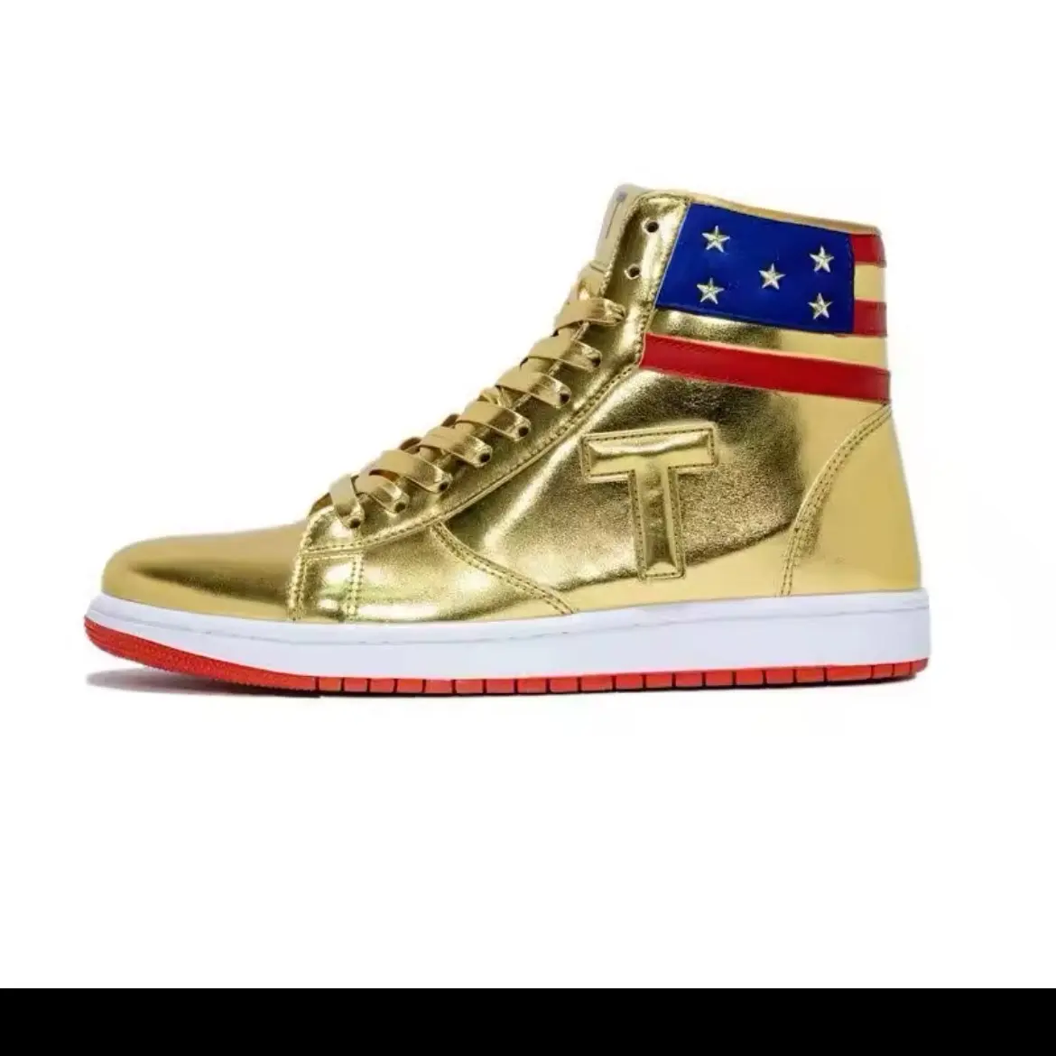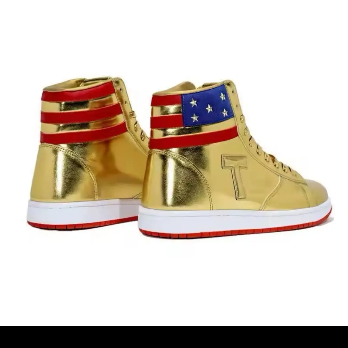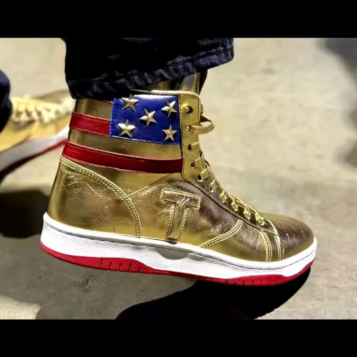 Introducing the Golden Trump Never Surrender Sneakers, a stylish and unique addition to any wardrobe. These sneakers are designed for men and are perfect for those who want to make a statement with their footwear. The sneakers feature a bold and eye-catching design that is sure to turn heads.