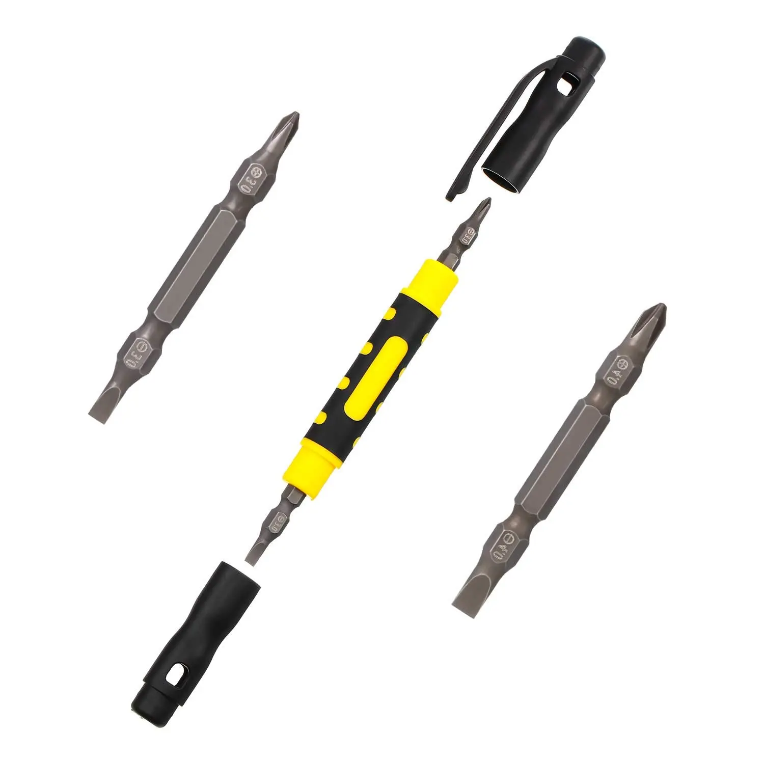 ·What you receive: package comes with 4 pieces 4 in 1 mini pen screwdriver, each pen screwdriver contains 4 pieces double-end screwdriver bits, including 2 pieces crossing bits, 2 pieces flathead bits, also comes with 1 piece mini magnet, enough quantity and different bits to meet your various needs
