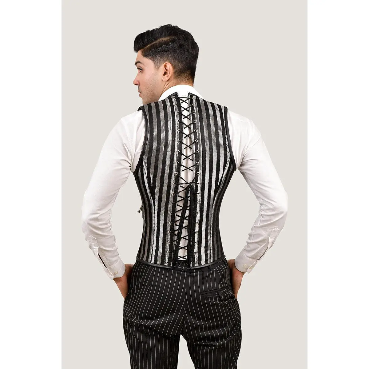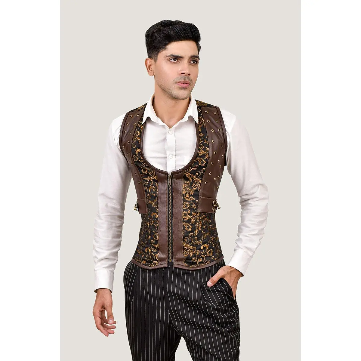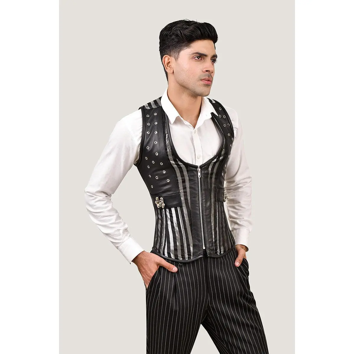 ·Style: Regular length corset vest with front zip closure and side clasps.