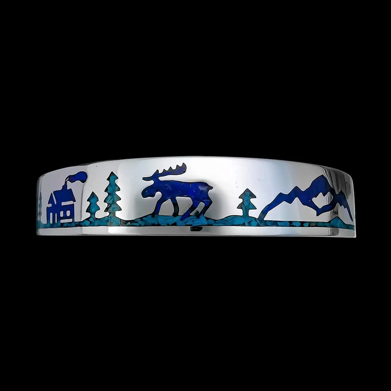 925 sterling silver cuff style bracelet with forest mountain cabin and a moose and mountain range scene. This bracelet is 10mm Tall/wide and it is 2mm thick. It is made for a size 6-1/4 inch wrist, and it weighs a total of 27.4 grams.