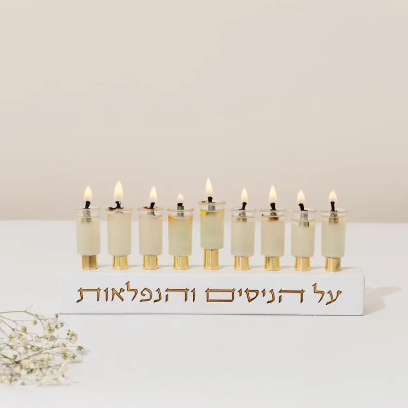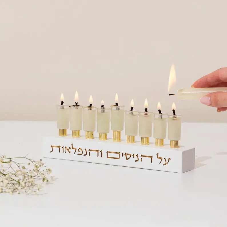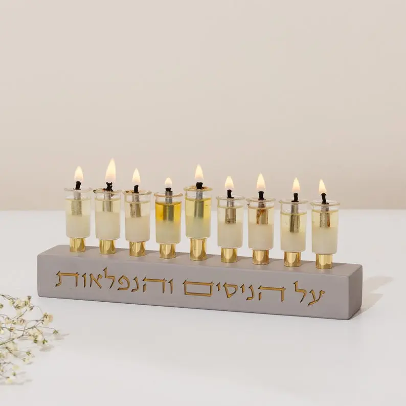 * Elegant Design: Features the Hebrew phrase "על הנסים ועל הנפלאות" (About the miracles and the wonders) and 24k gold-plated candle cups that add a touch of sophistication to the modern concrete base.