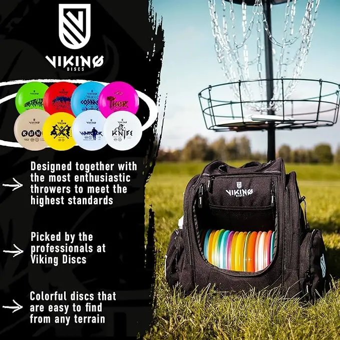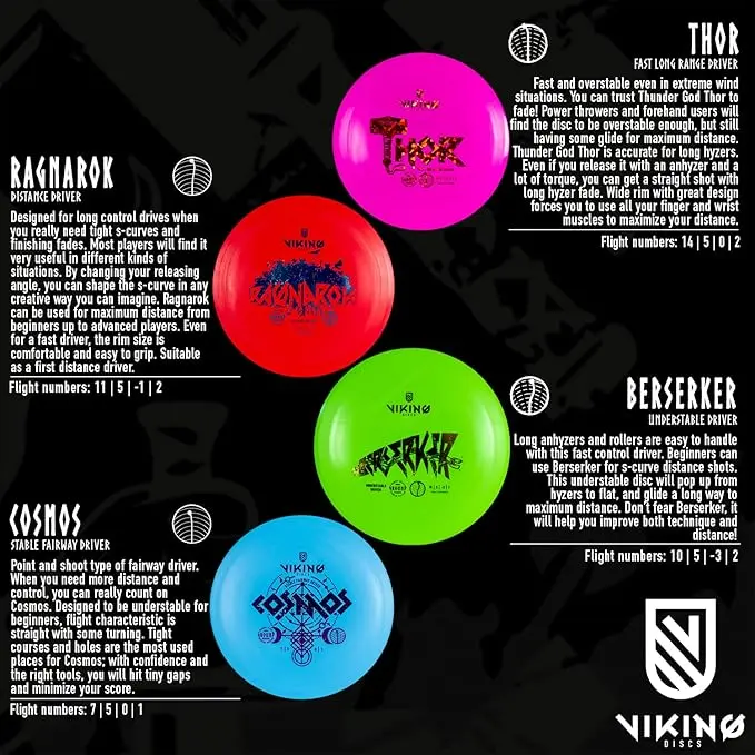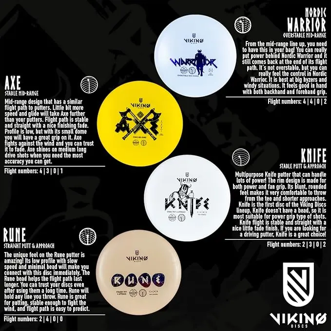 This is a complete 8 Disc Set from Viking Discs - featured in their Ground Plastic. This bundle includes the 8 original discs from Viking Discs, a Finnish brand with rising popularity. Buying the set allows you to save money over buying each disc individually, plus it's a great way to grow, or start, you collection!