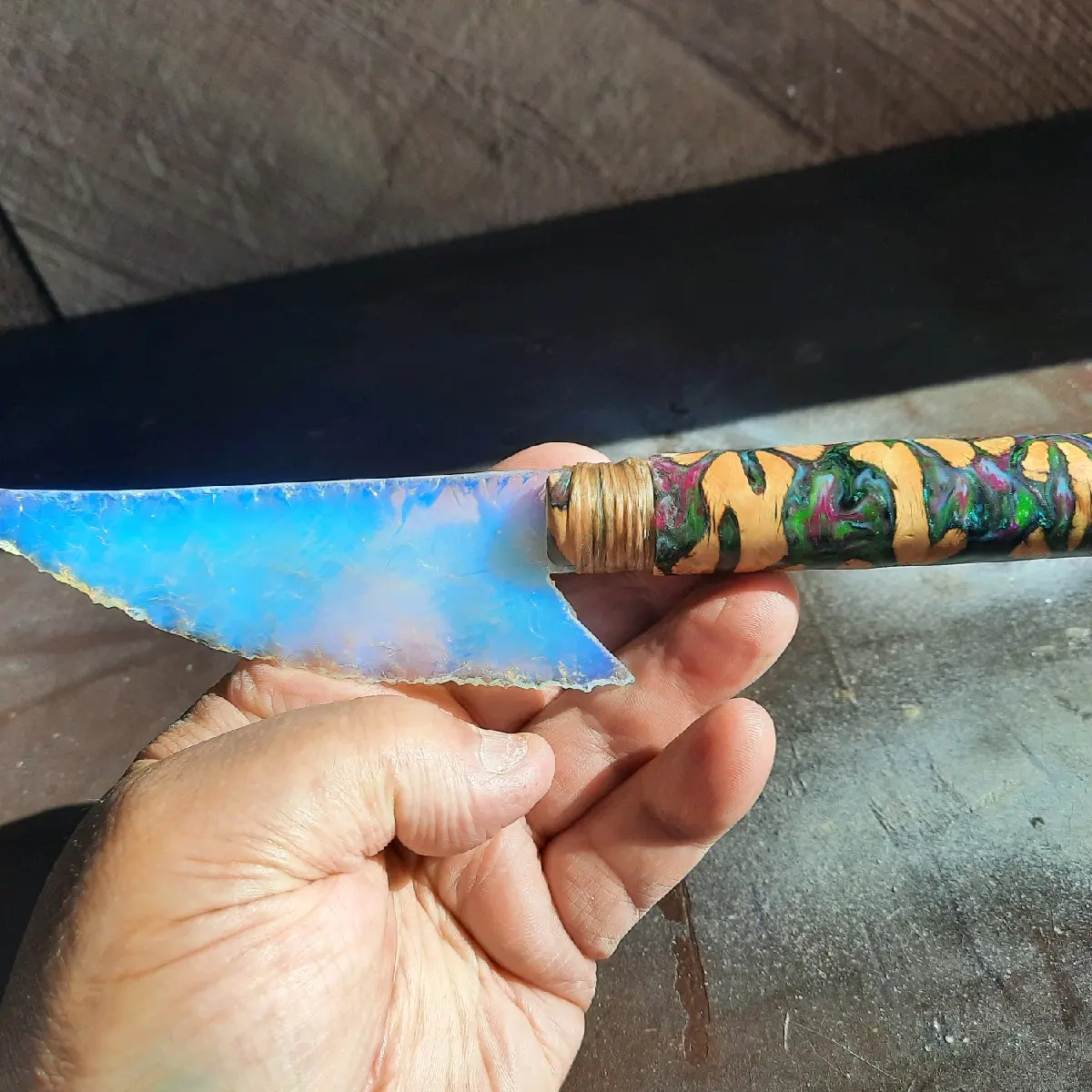 Flint knapped art custom knife made of opalized glass blade with cholla cactus wood and dyed and stabilized acrylic custom handle