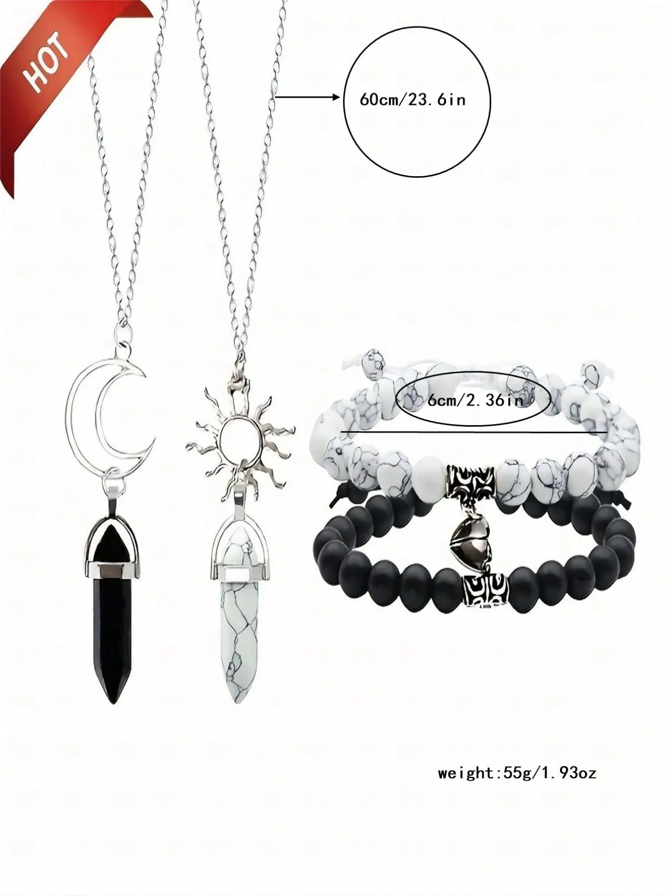Unisex Fashion Marble Heart Magnet Beaded Bracelet & Moon & Sun Pendant Necklace, Matching Jewelry Set, Fashion Jewelry for Party, Daily Clothing Decor, Trendy All-match & Exquisite Jewelry for Birthday Gift