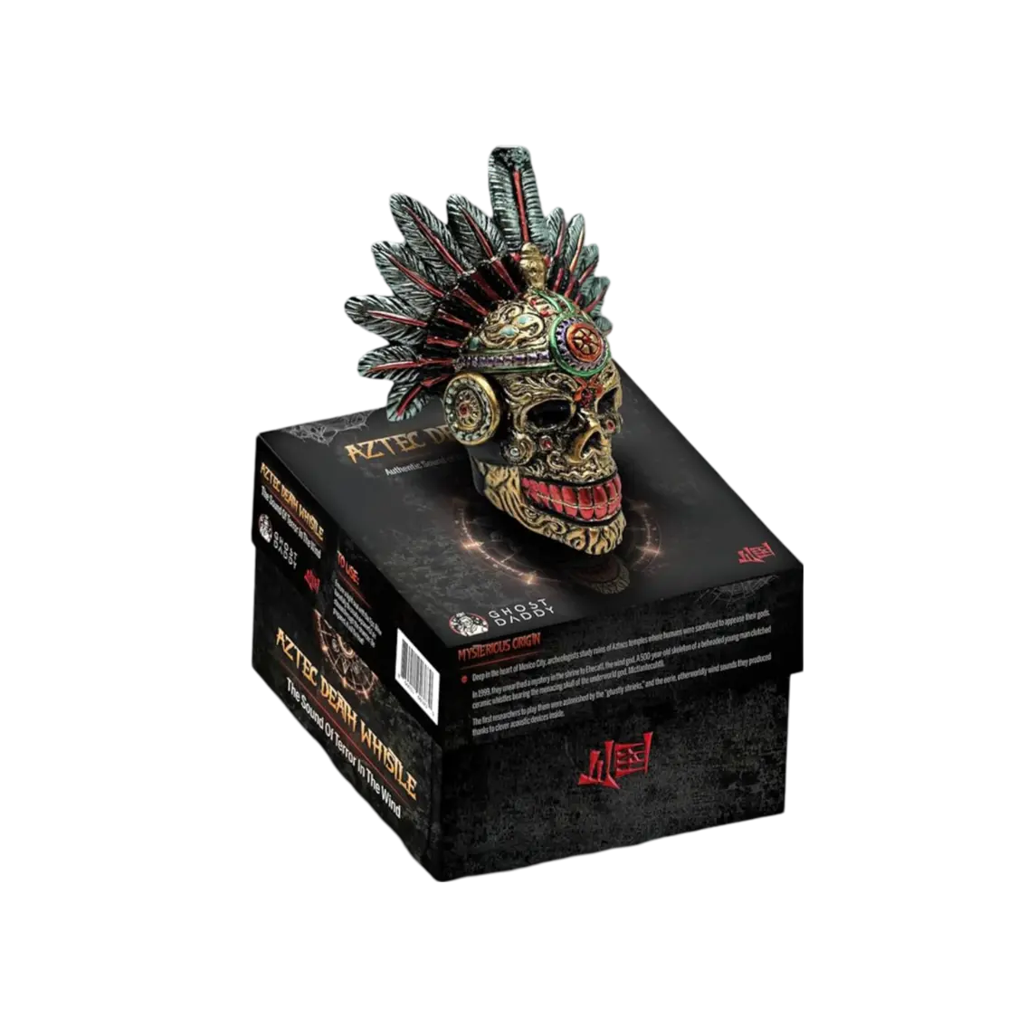 Our intricately designed replica pays homage to the clay whistle representing Mictlantecuhtli, the underworld’s Aztec lord. The Ghost Daddy Aztec Death Whistle emits that original sound, a haunting blend of human-like screams and echoing winds. Made of high-quality ceramic, this display-worthy piece is ideal for Halloween or self-defense.