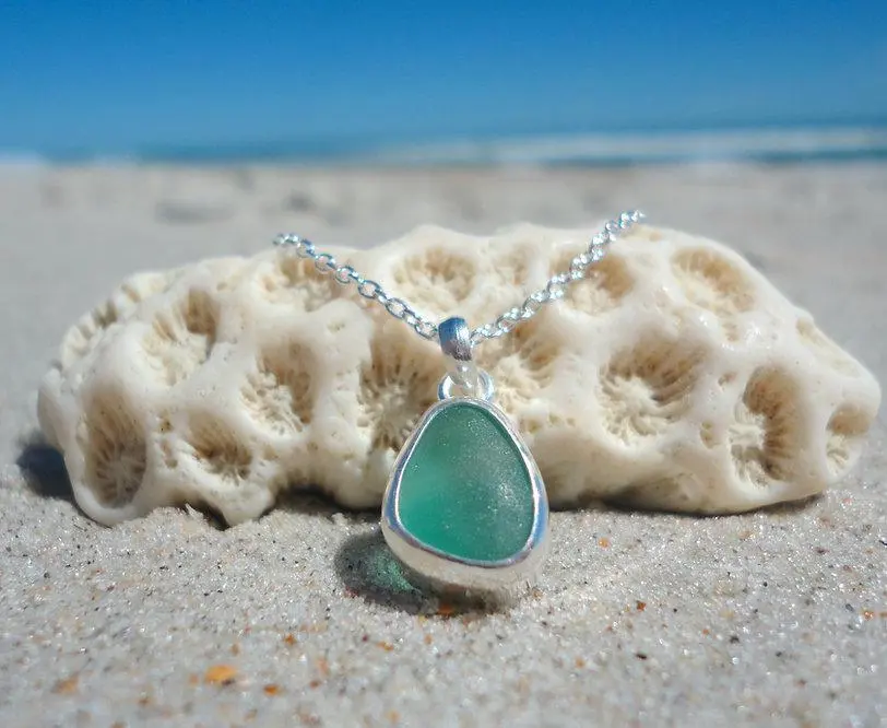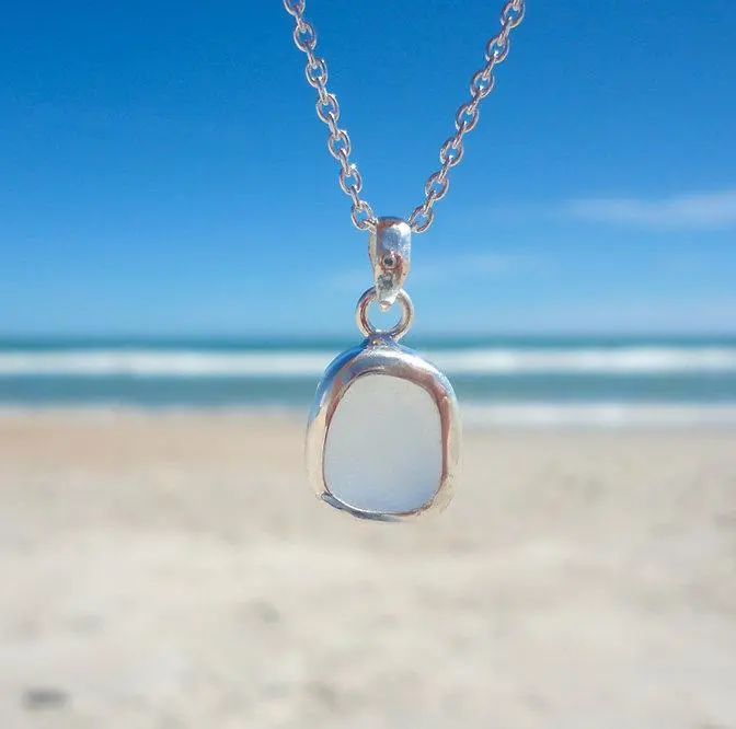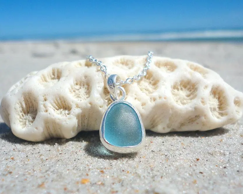 This beach necklace comes on an adjustable 18 inch sterling silver chain and the sea glass pendant measures about 10x14mm. Each pendant will vary slightly in shape as each is handmade to the shape. Ready to be given as a gift with a custom card and hand stamped box.