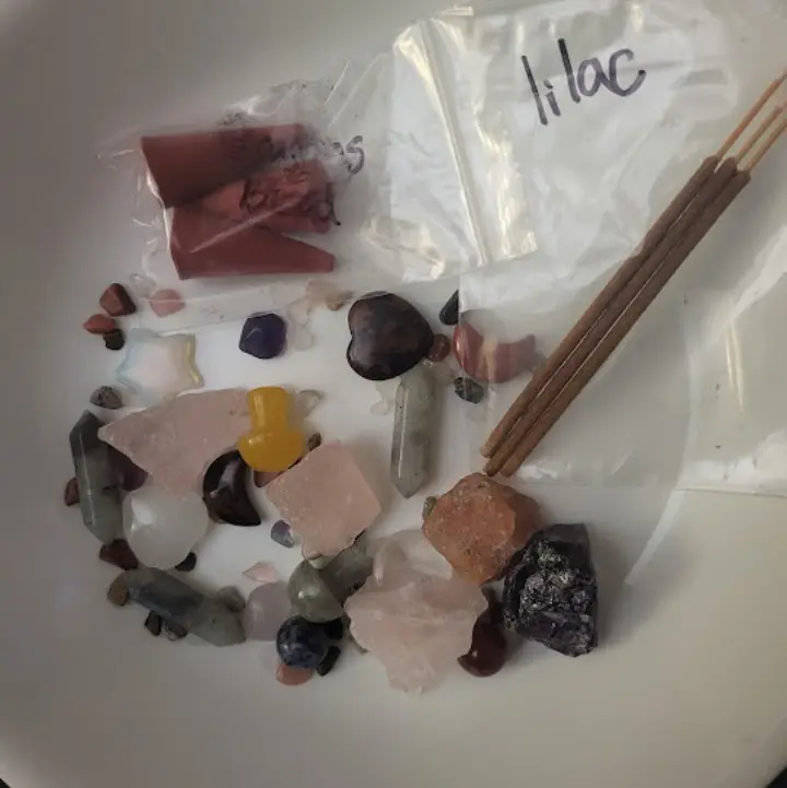 This product is a variety of crystal chips, tumbles, mini spheres, carvings, mini points, and more. The seller includes incense sticks and cones in every order. The product is a witchy scoop, and the picture shows one scoop. Customers can get as many as they want for a larger variety.