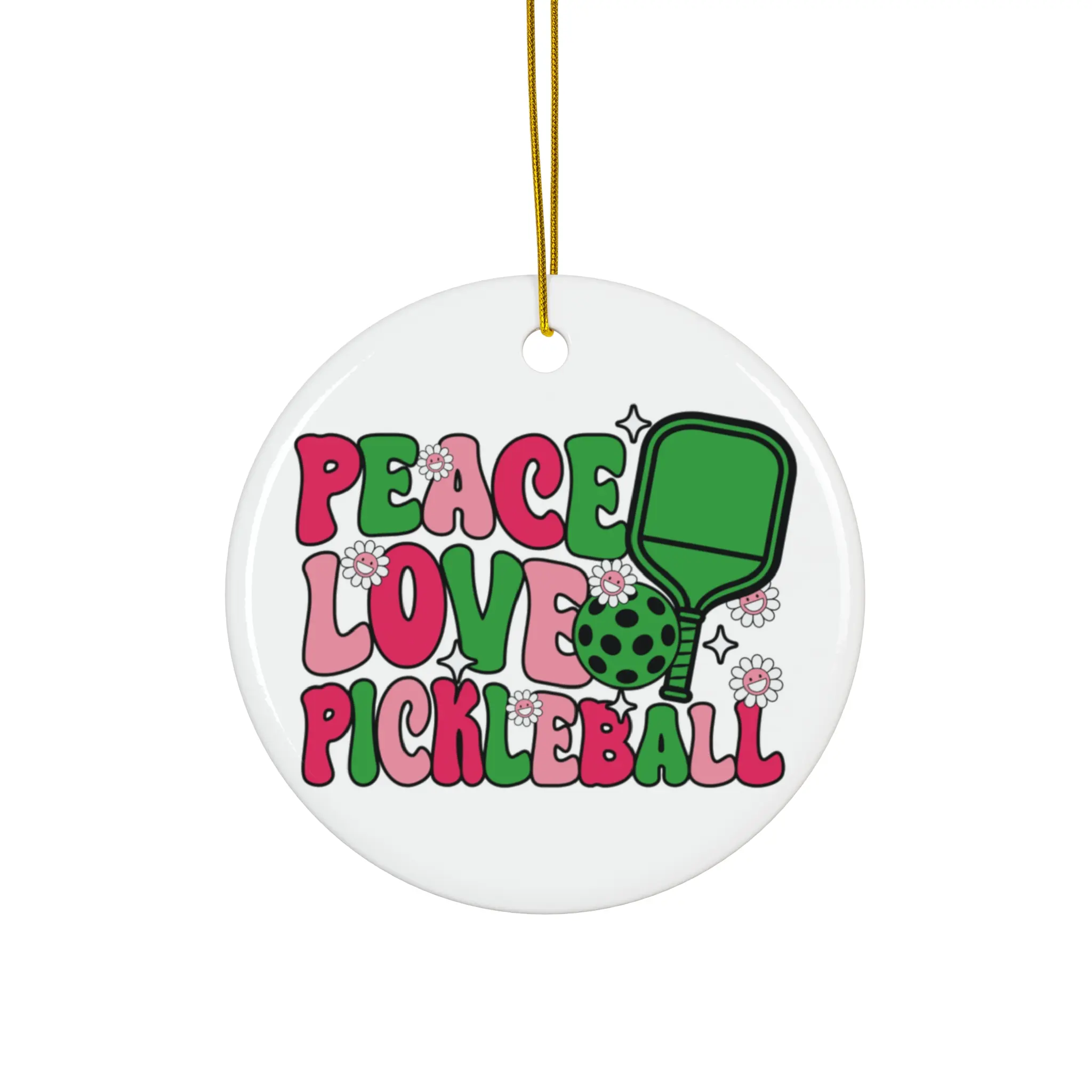This ceramic ornament features vibrant colors and a design with peace, love, pickleball paddle, and ball icons. Perfect for pickleball enthusiasts to hang on their Christmas tree or gift to fellow players during the holiday season.