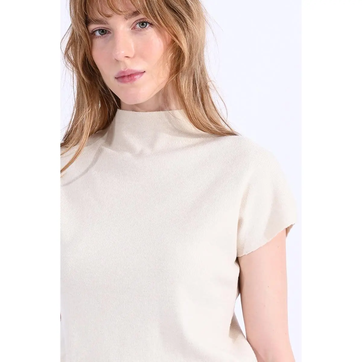Crafted from luxurious viscose, this finely ribbed capped sleeve sweater delivers understated elegance with its structured stand-up collar and streamlined silhouette. The refined ribbed texture adds visual dimension while maintaining a sleek profile perfect for layering or standalone wear. A versatile wardrobe essential that transitions seamlessly across seasons.