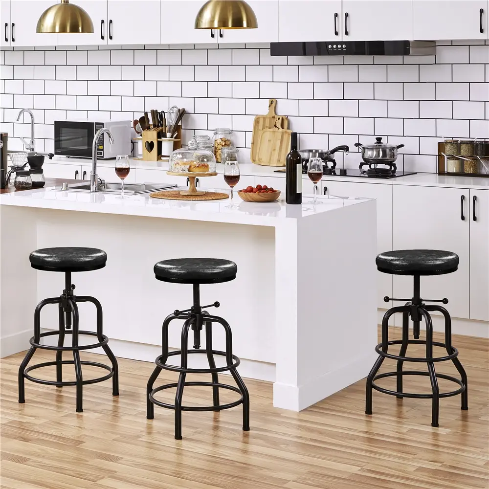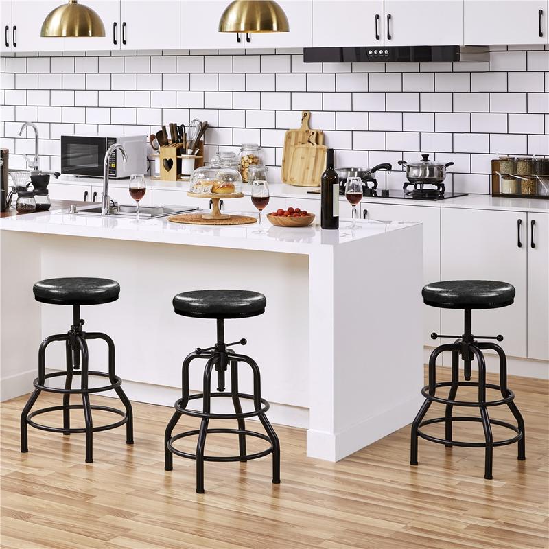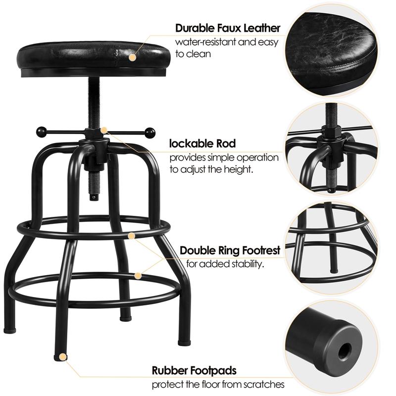 Need a rustic industrial bar stool for your kitchen island or dining room? This bar stool may be ideal for you. Crafted with water-proof faux leather and powder-coated metal, the stool is strong and long-lasting for kitchens, dining rooms, home bars, restaurants, etc. The soft foam-padded seat also brings you a comfortable seating experience. It weighs 13.4 lb but can hold up to 300 lb. The stool with an adjustable height ranging from 21.5-28″, serving you well from breakfasts to midnight drinks. The double-ring footrest not only provides extra support for resting your legs but also enhances stability and secures the stool legs. No installation is required!