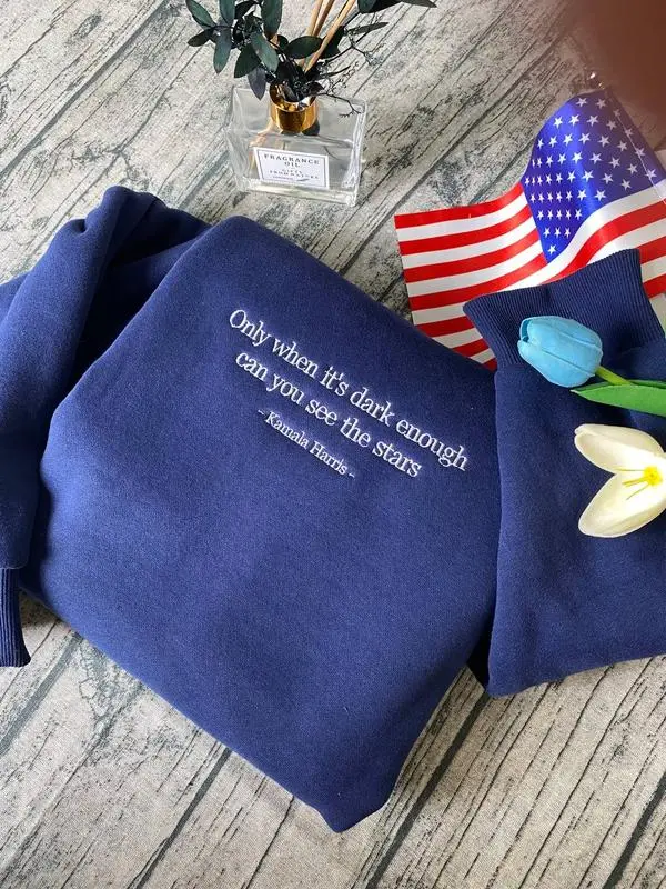 This Kamala embroidered shirt sweatshirt hoodie features a powerful feminist message with a quote from Kamala Harris, "Only When It's Dark Enough Can You See The Stars."