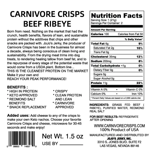 Carnivore Crisps Beef Ribeye is considered the crown jewel of the beef world. No matter how you like your beef, if you love beef, this product will not disappoint. It's sliced razor-thin with the rib cap, lip, and eye intact. This means you get the whole primal in one amazing crisp! Try it for yourself and see why this is our best seller that we struggle to keep in stock. Order while it's available, as it won't last long.