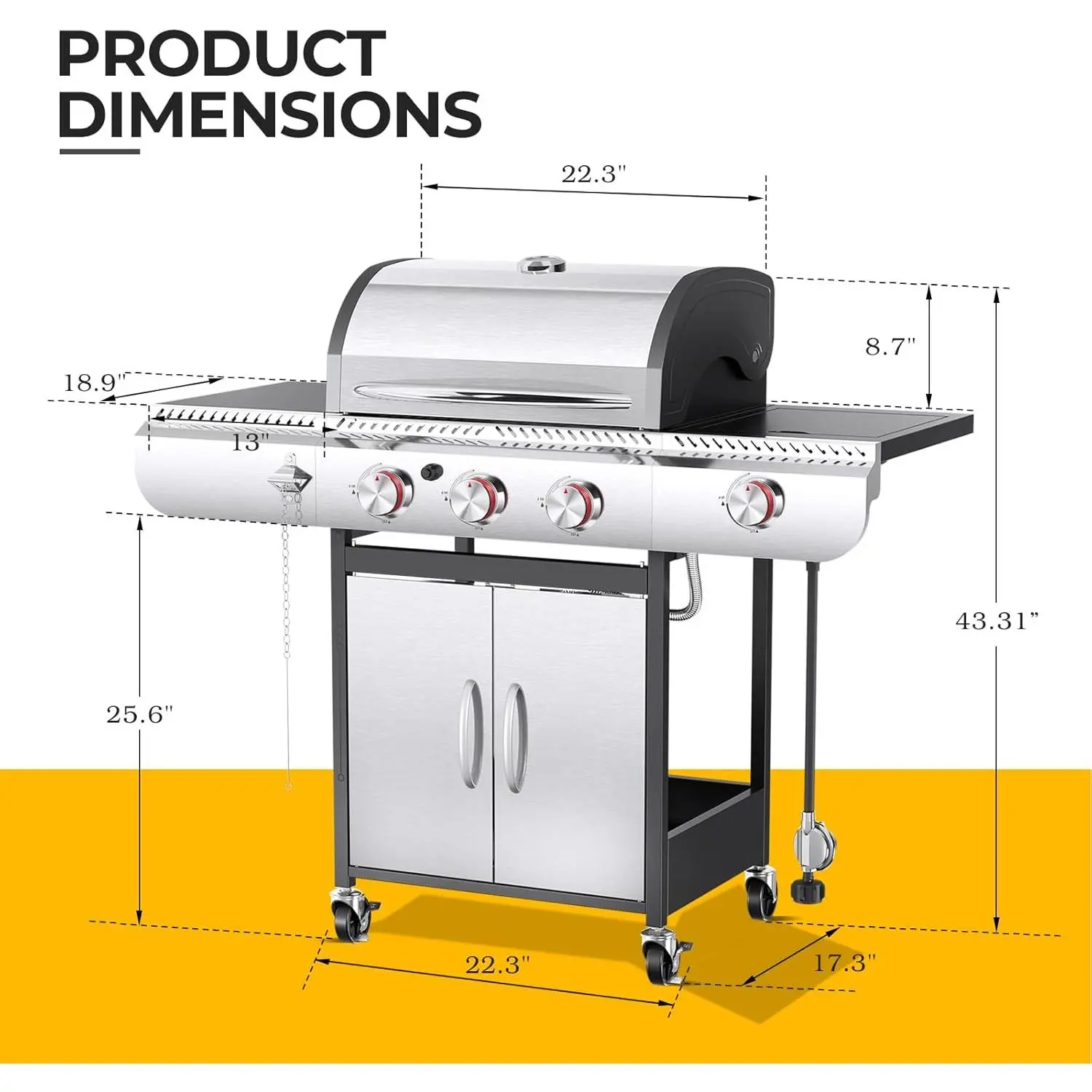 Available in both 3-burner and 4-burner options, this outdoor propane grill is designed for convenience, versatility, and performance. Whether you're grilling for family or hosting a backyard gathering, this grill offers powerful heating, generous cooking space, and easy mobility, making it a perfect addition to any outdoor setup.