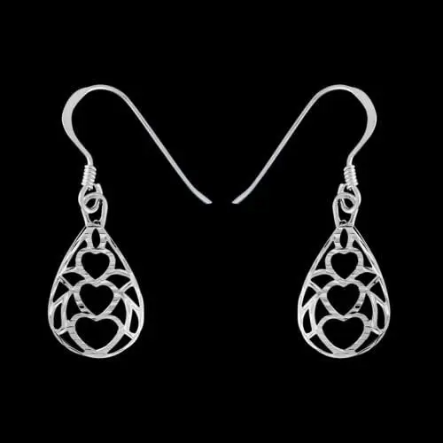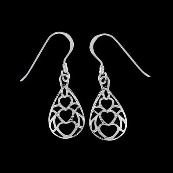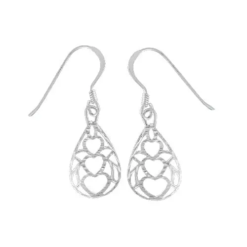 925 sterling silver teardrop dangle earrings with stacked hearts design surrounded by fillagree. These earrings measure 3/8 inch wide by 3/4 inch tall. These earrings are finished with the diamond cut option.