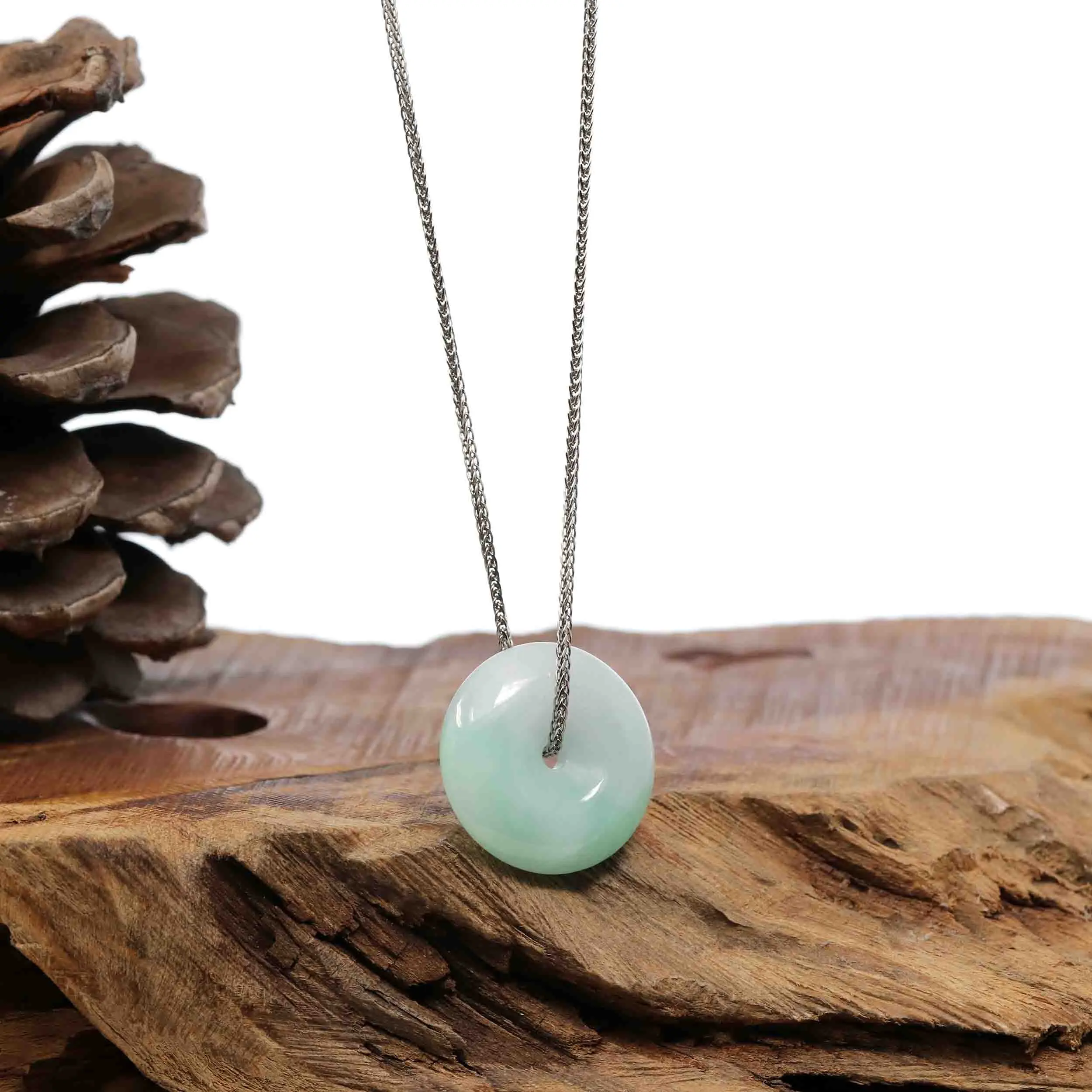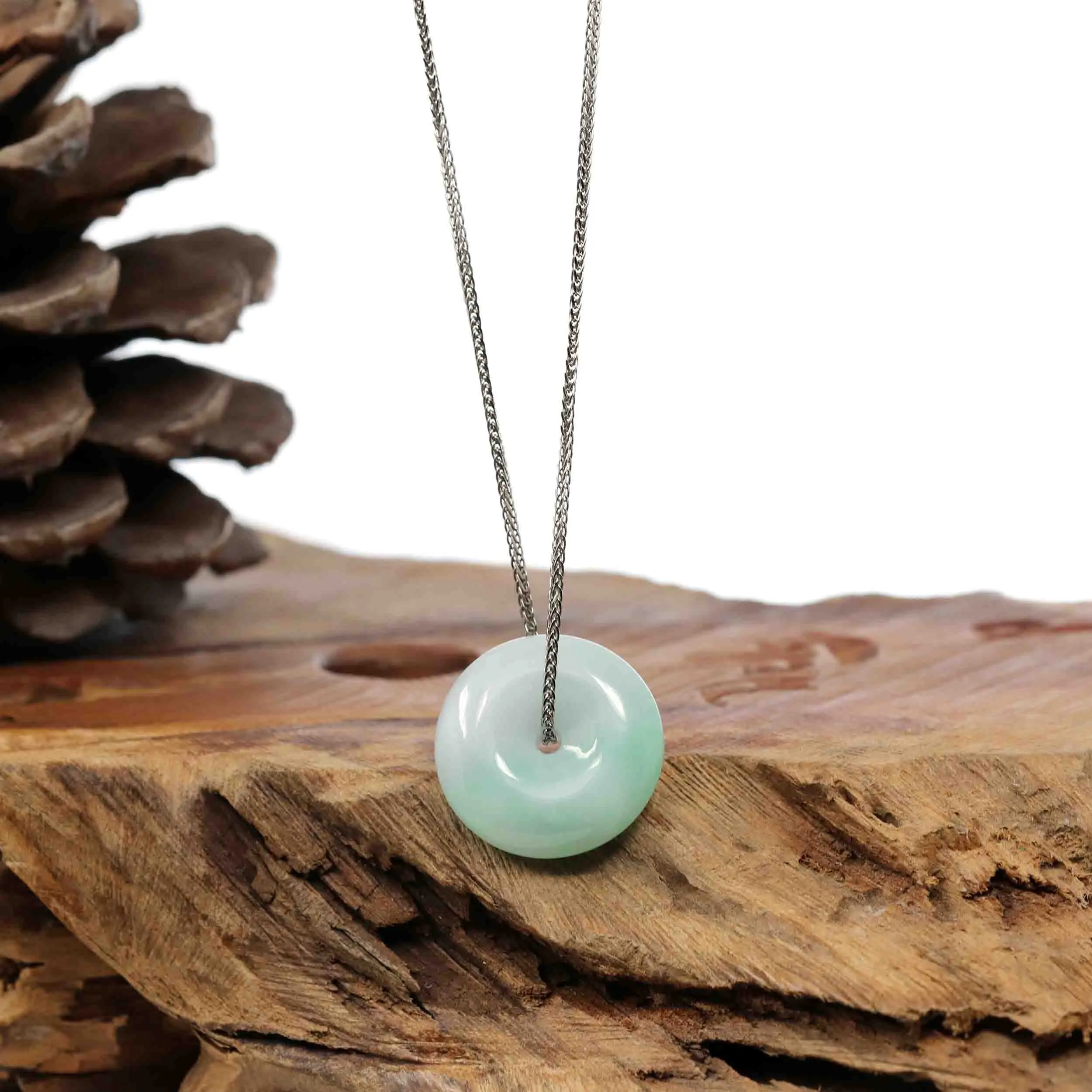 -- Introducing the Baikalla "Good Luck Button" Necklace, a captivating pendant that combines craftsmanship and allure of jadeite jade. The phrase "Circle of Heaven" is shown through the jades smooth shape that represents happiness, wholeness, and prosperity. High-quality white hues and unique stripe of green makes this necklace great for everyday wear or for special occasions. Embrace the Circle of Heaven and all its prosperity with the Baikalla "Good Luck Button" Necklace.