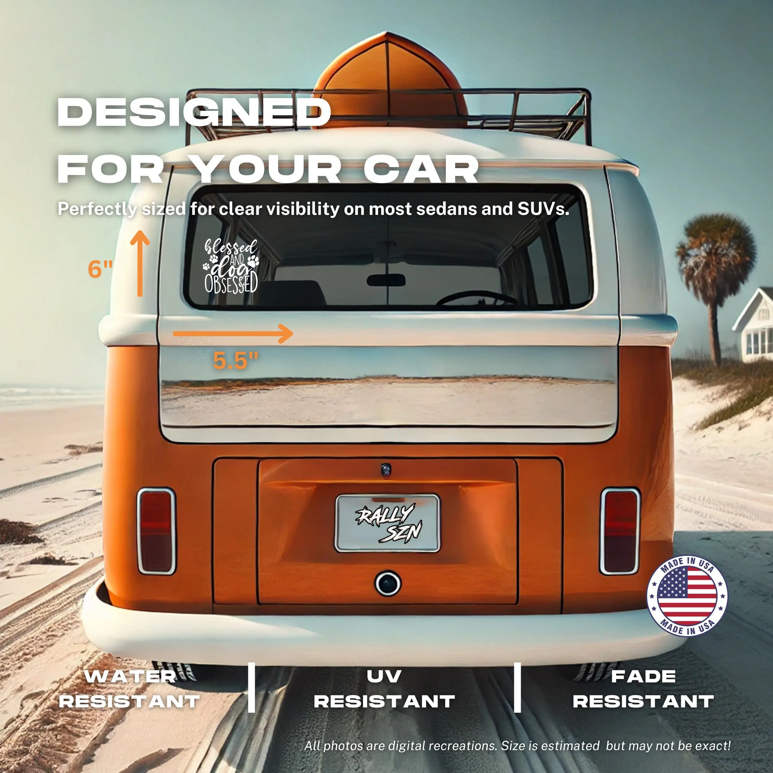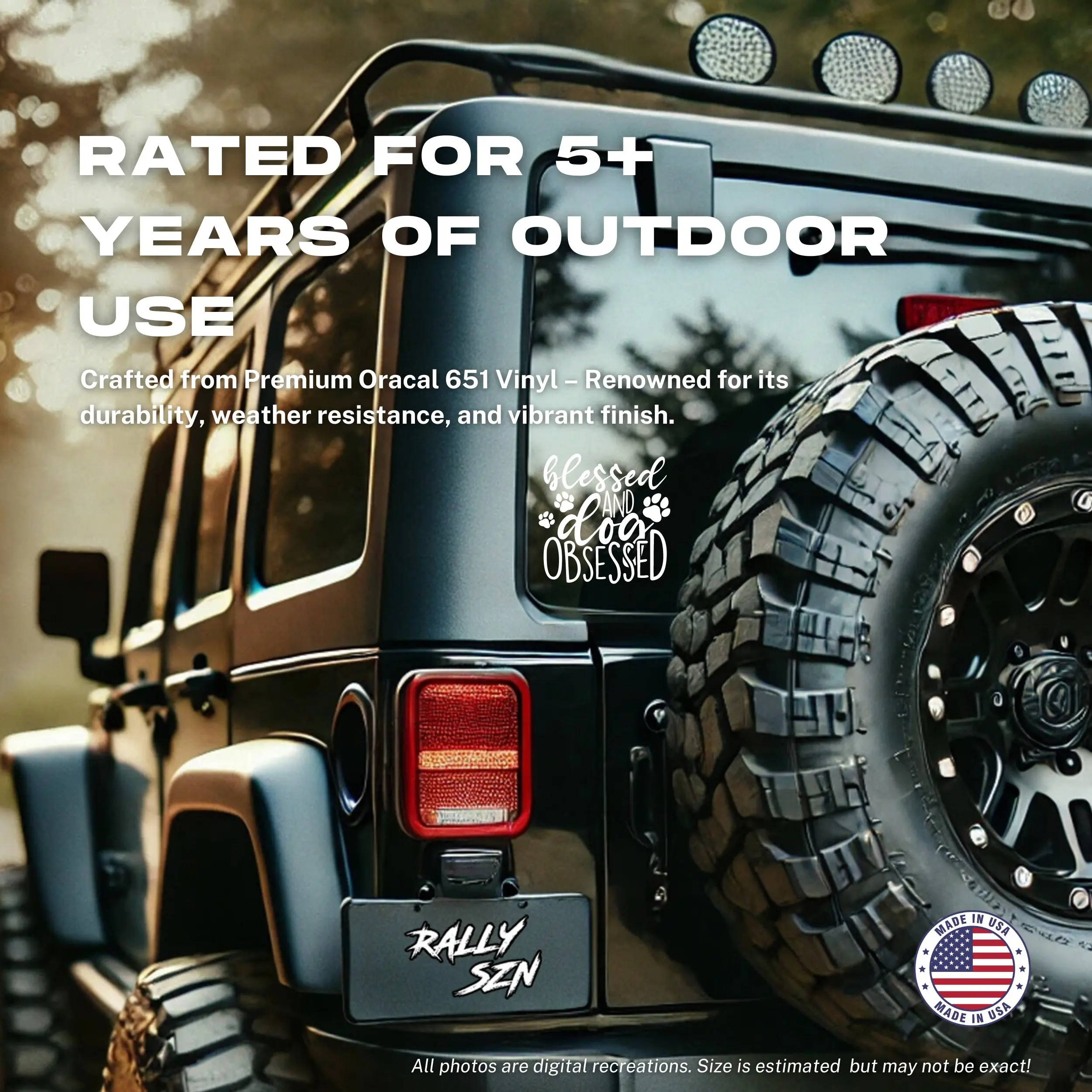 Blessed and Dog Obsessed Vinyl Decal Sticker made from high-quality Oracal 651 vinyl, rated to last 5+ years outdoors with proper installation. Includes a prep pad and easy-to-follow installation instructions. Proudly made in the USA.