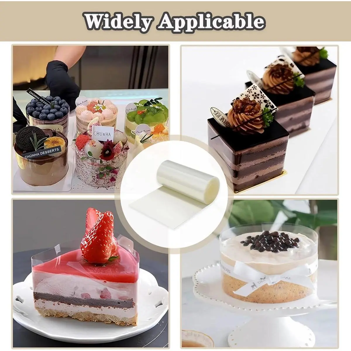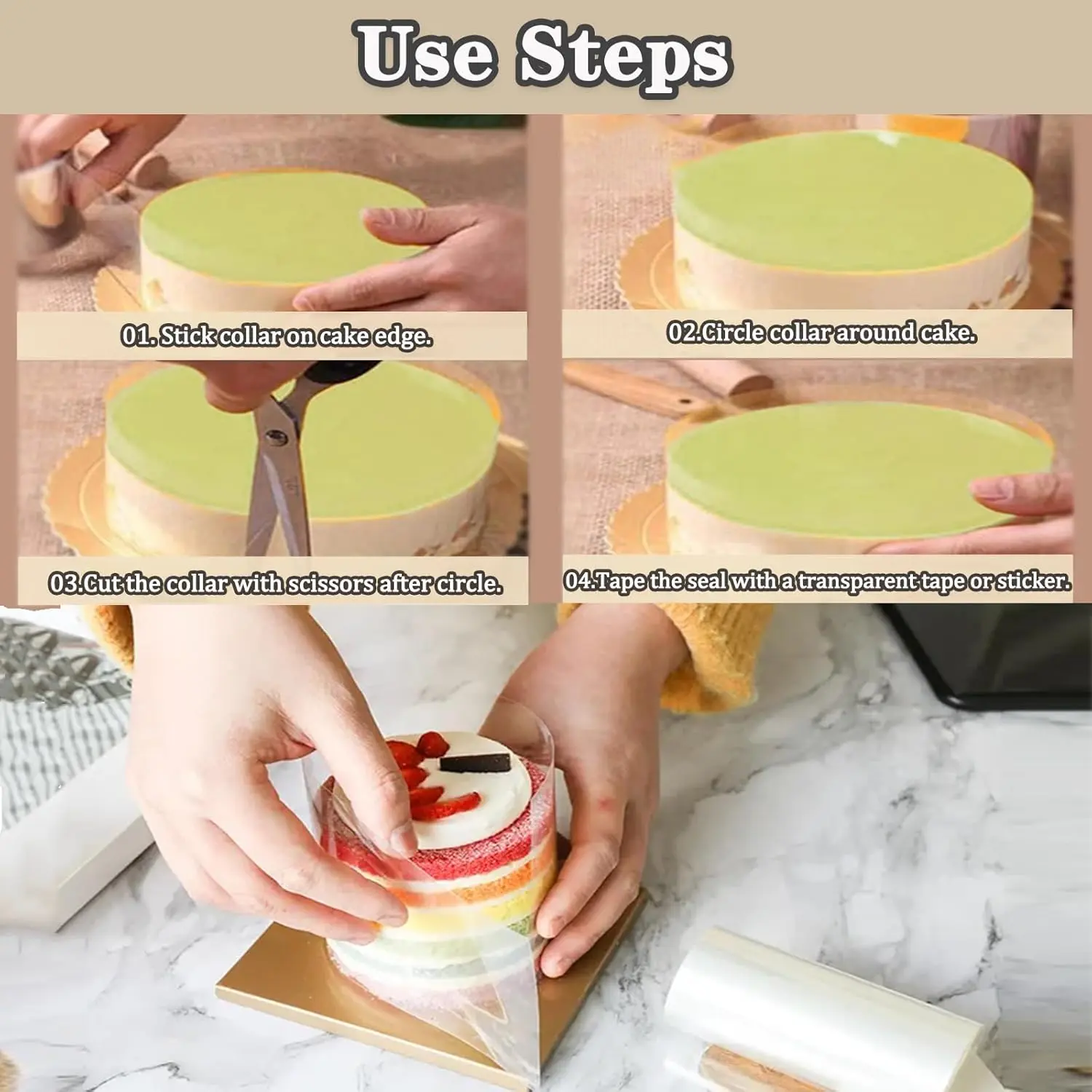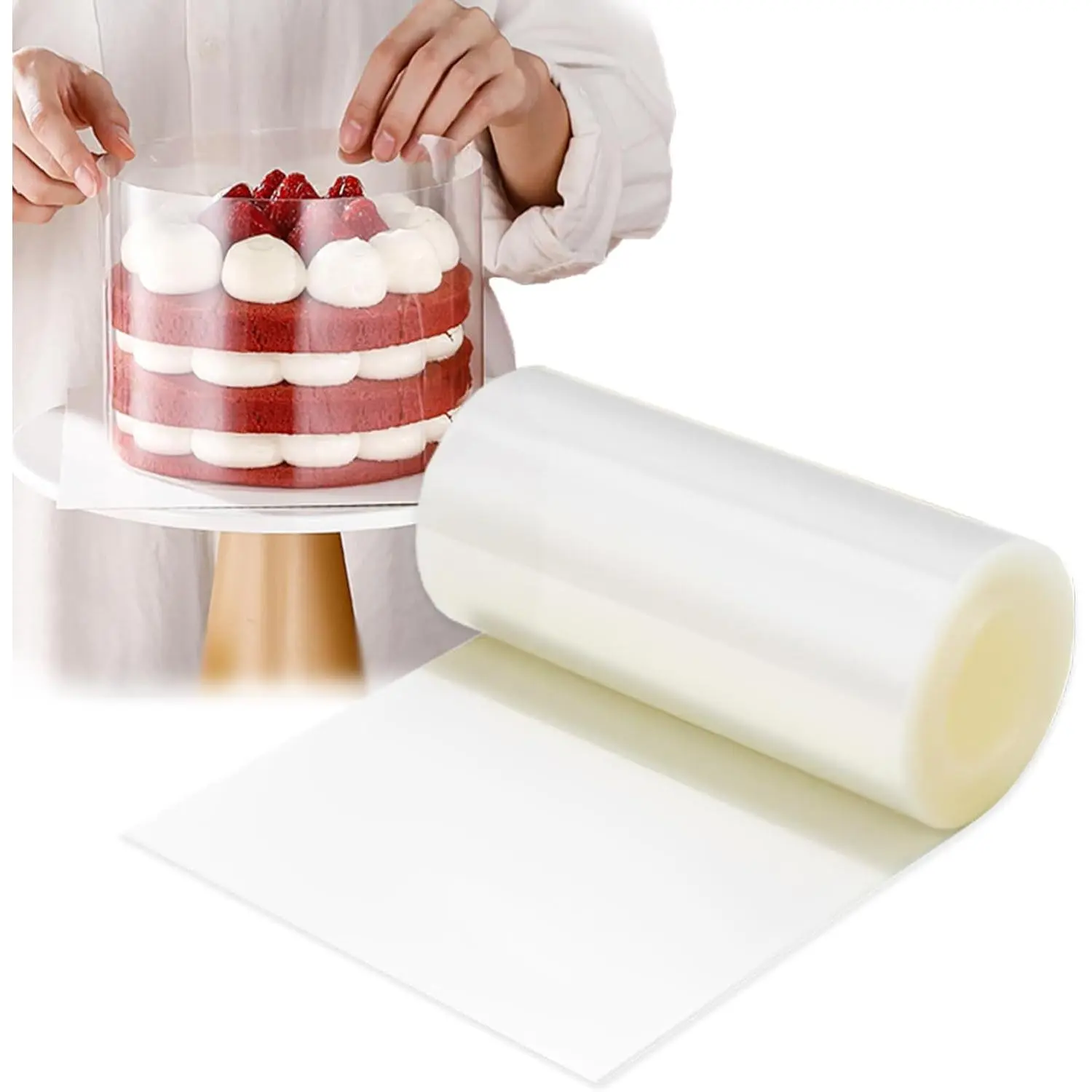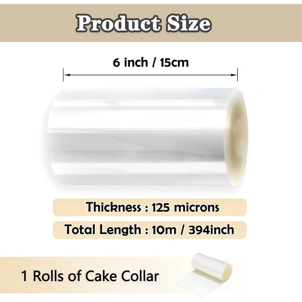 ·ACETATE COLLAR SIZE ---- Each cake collar roll is 6 inches wide and 394 inches long, and you can cut it to any length you need to make a variety of cake sizes, helping you protect the integrity of the cake from damage.