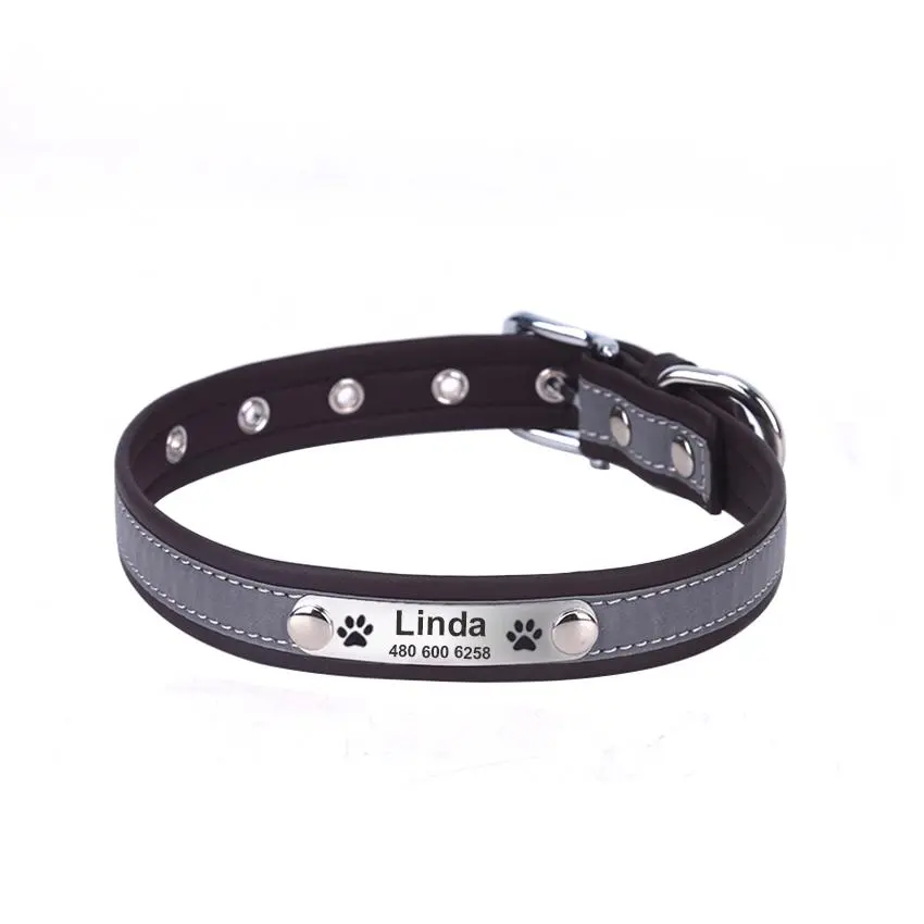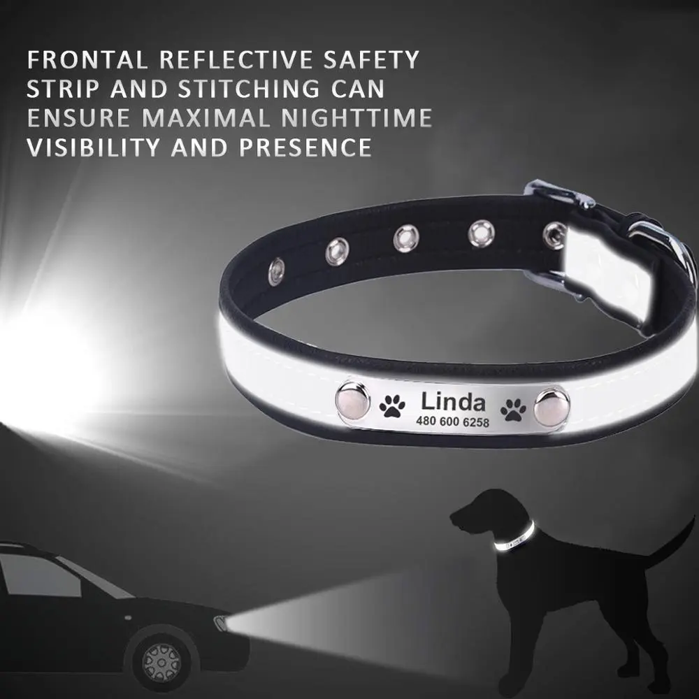 Personalized Leather Dog Collar - Reflective Custom Engraved ID Tag for Cats and Dogs