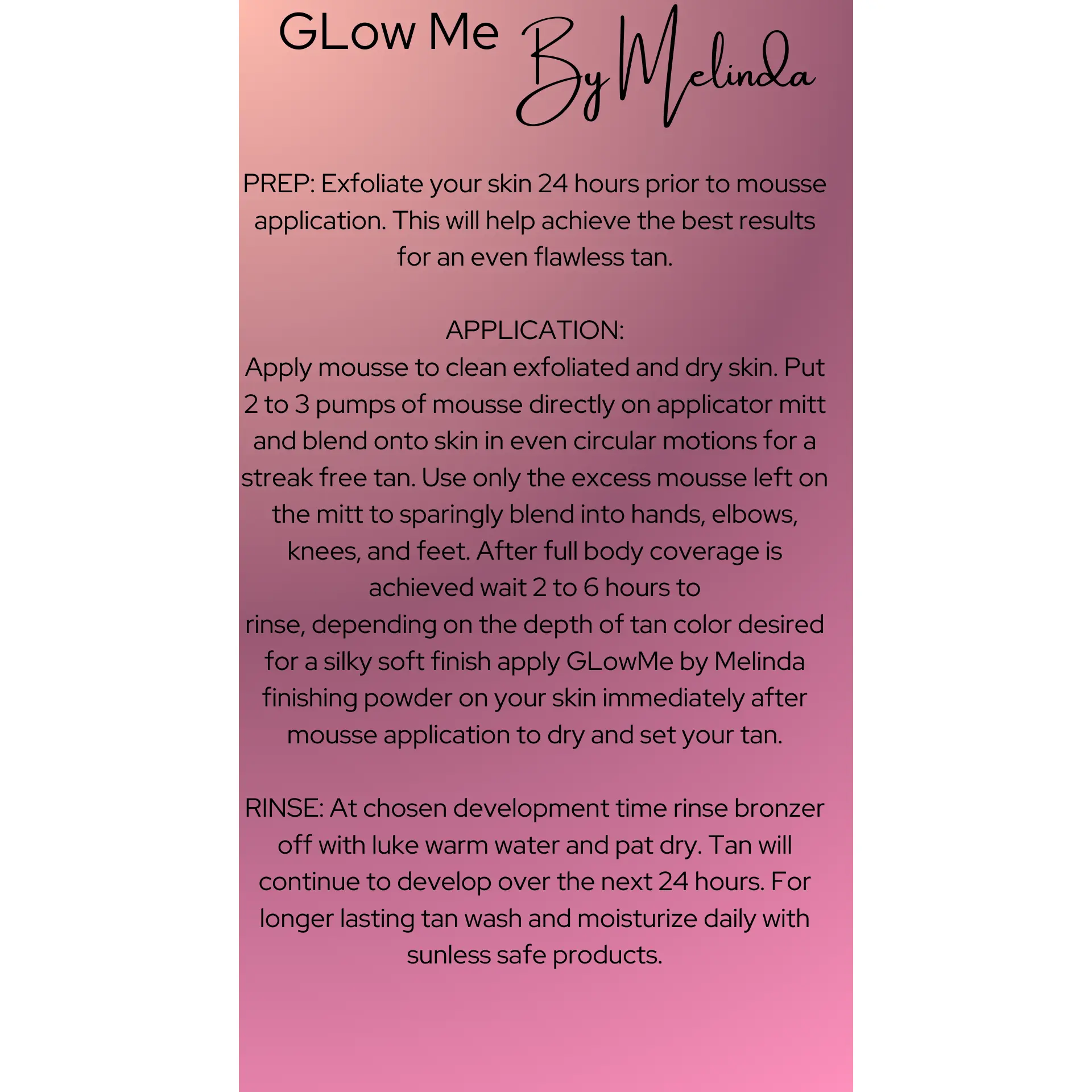 GLowMe by Melinda Bronzing Mousse- full body rapid rinse bronzing mousse that has a fresh, clean scent and leaves your skin with a natural, beautiful tan immediately upon application. The rapid developing mousse will develop between 2 to 6 hours leaving a natural medium to dark tan. It can create a beautiful bronze glow on all skin tones. Layer up for darker results.